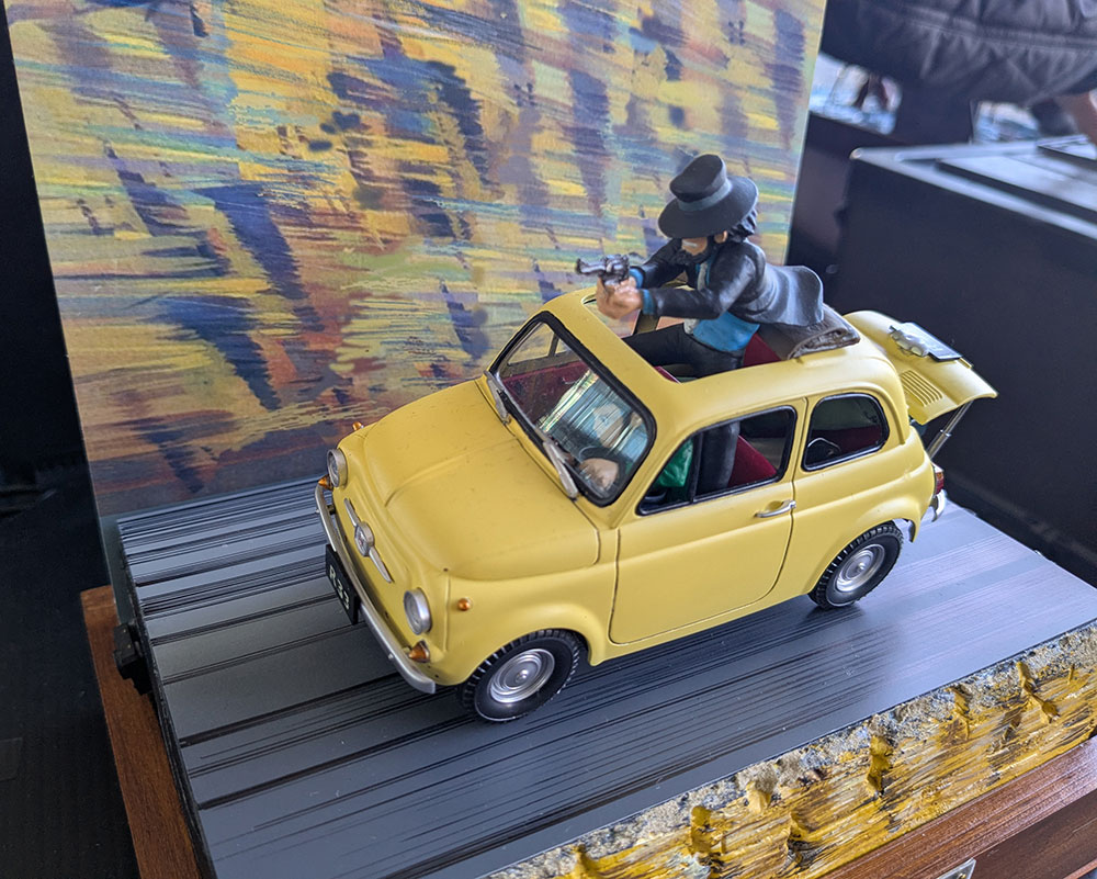 コチラは皆様もご存じルパン三世!カリオストロの城のワンシーンでしょうか。劇中シーンの再現のためフィアットの車内も作りこまれていました(写真に映ってませんでしたが後部座席小物が結構ありました)!大人2人が入ったらせまっ苦しいこの感じがルパンらしくて良いですよね。スピード感のある背景も素晴らしい。