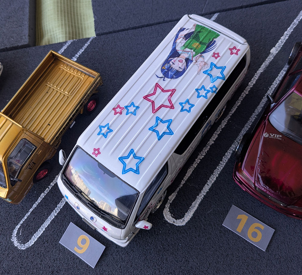 カーモデルが沢山並んでるエリアがあり、何とはなしに眺めていると、見覚えのあるキャラクターが…。プラモ向上委員会さんのラッピングカーがありました。デカール売ってましたっけ?デカールを自作できるアイテムとか使って自作のデカールなのかな?実際に走ってたら面白いなぁ。