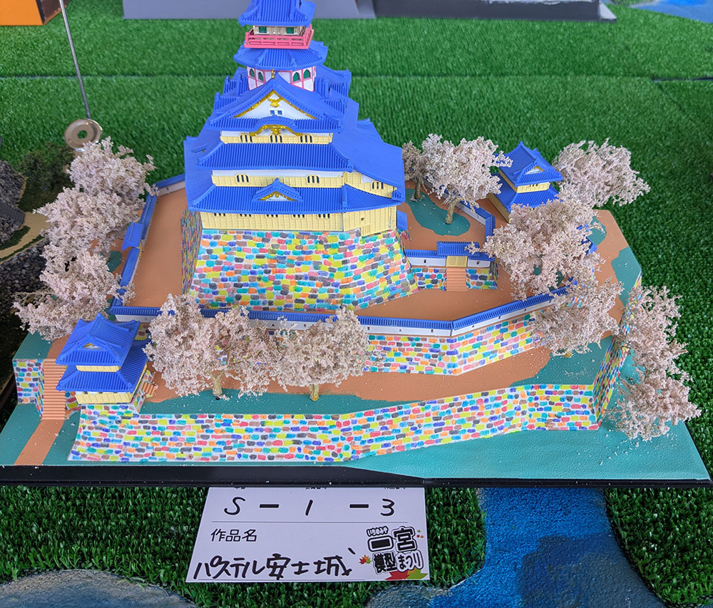 お城の模型エリアもあって「これは思い切ったな!」と思ったのがこちらのお城。日本の名城にパステルをもってくる発想は私にはなかった。意外と有り。石垣を単色にせずにちゃんとランダムに色を配置していて根気あるなぁ~と感心してました。