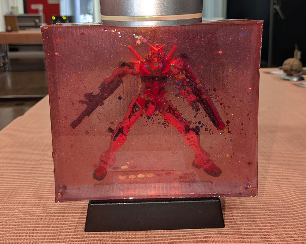 こちらはLEDを使った作品の展示ルームあった作品。赤いガンダムがレジンに完全に沈んでいて衝撃的でした。作中の「キラキラ」の再現をこのような形でやるとは驚きです。こんな巨大なレジン加工なのに大きな気泡が見当たらないのもスゴイ。