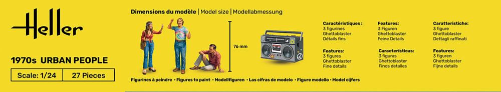 1970年代、街に生活する若者が休日に仲間と楽しいひとときを過ごす様子を再現した1/24スケールのフィギュアのセットです。フィギュアは3体。各フィギュアのファッションは70年代に一般的だったファッションをイメージしてモデル化しています。フィギュアは男性2体と女性が1体。女性は当時のヒッピーカルチャーを思わせるファッション。頭につけたヘアバンドや厚底のサンダルなどが特徴的に表現されています。男性2体はTシャツにジーンズ、長髪の若者ともう一体はスラックスにカジュアルなシャツ、頭は7:3に分けた短髪でモデル化。立ちポーズの男性は大型のラジカセを肩に担いだポーズ。もちろんラジカセもしっかりと再現しています。パーツ点数は27点、フィギュアの身長は76mm。服の皺やズボンのベルトなどのディテールもリアルに表現。Tシャツに描かれたポップなカラーの模様はデカールで用意されています。1/24スケールの各種カーモデルと一緒にディスプレイして70年代の休日を再現してください。