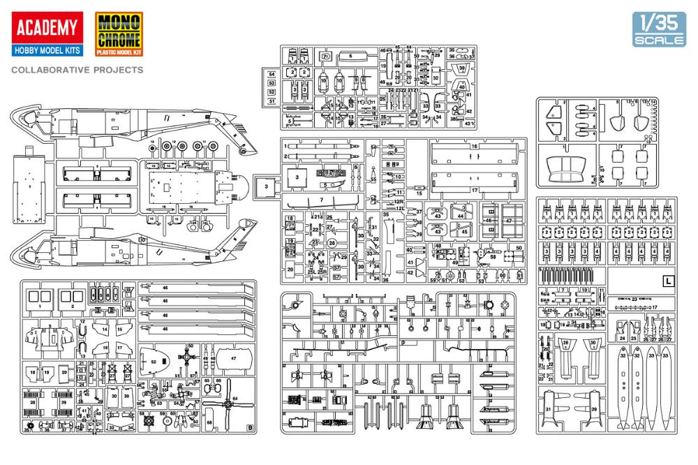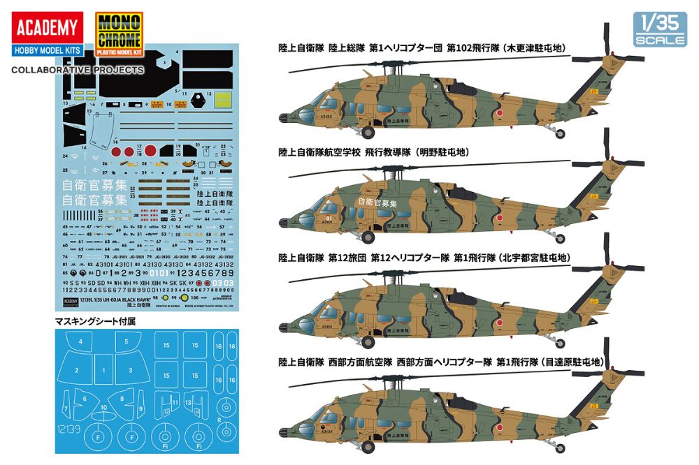 陸上自衛隊多用途ヘリコプターUH-60JA ブラックホーク(通称ロクマル)が登場します。機体内部の兵員搭乗室とコックピット、赤外線暗視装置や増加燃料タンクを精密に再現しています。陸上自衛隊ヘリコプター隊のデカール4種とキャノピー塗装用マスキングシールが付属。