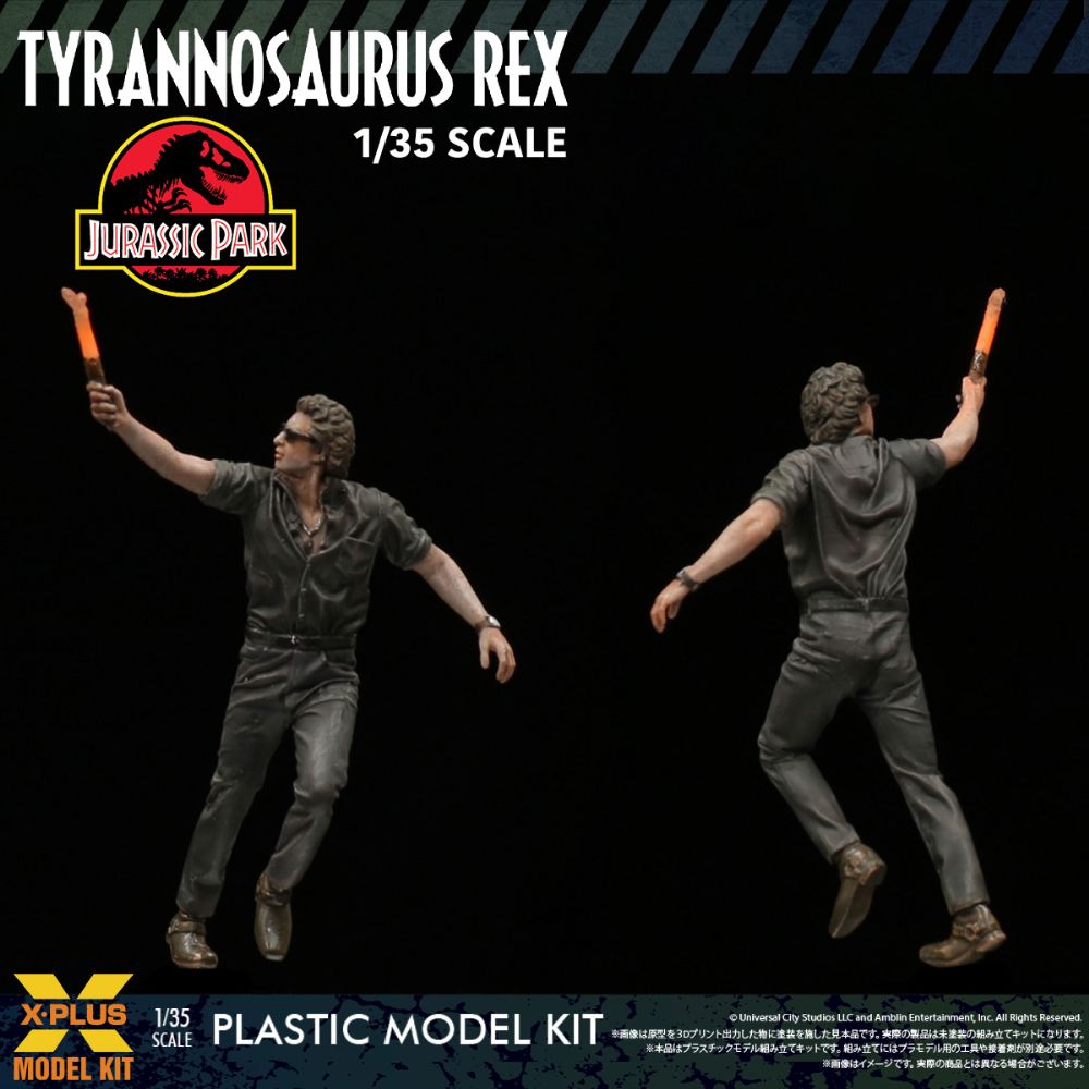 1/35というミリタリーモデルの標準スケールで、映画『ジュラシック・パーク』に登場するT-レックスをモデルキット化しました。嵐の夜、地響きと共に現れ、メインロードでツアー参加者を恐怖のどん底に突き落としたあの名シーンを再現。インナーボディに表皮パーツを重ねていく構造により、T-レックス特有の美しい曲線美や繊細なディテールをプラスチックで余すことなく表現しました。強度と軽量さを兼ね備えたプラスチック素材の特性を活かし、PVCやポリレジンでは保持が困難な「片足立ちの躍動感あるポーズ」を実現。脚を引き上げ収縮する太腿の筋肉や、体重移動による腰の傾きなど、生物的な躍動感をお楽しみいただけます。同スケールのイアン・マルコム博士と並べることで、T-レックスの圧倒的な巨大感も実感いただけます。
