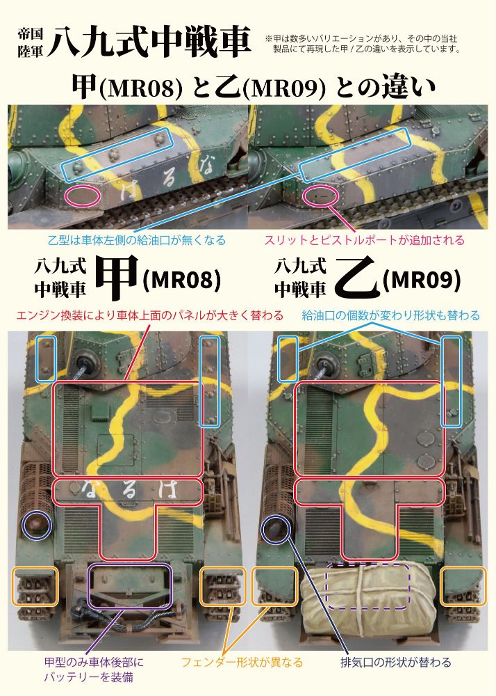 八九式戦車は国産初の量産戦車で、当初八九式軽戦車として制式化されましたが、様々な改修を受け重量が増大したことと、より軽快な戦車が開発されたことにより、八九式中戦車と名称が改められます。その後空冷ディーゼルエンジンを装備した乙型が開発され、それまでのガソリンエンジン装備車両は甲型と呼ばれました。