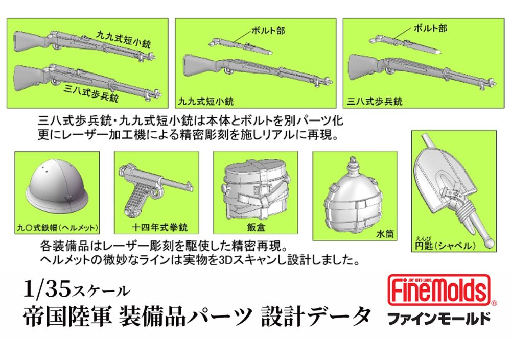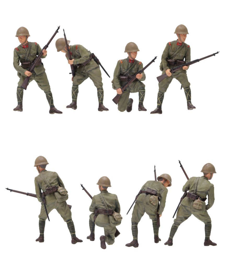 本キットではノモンハン事件中にまだ多く見られた昭和5年に制式化された、立て襟型のいわゆる昭五式軍衣を着用している戦闘中の兵士4体を再現しました。軍装は当社所蔵の実物を採寸し、ゲートルの巻き方も正確に再現。小銃・鉄帽(ヘルメット)などは、レーザ加工機により精密に再現しました。階級章・襟章のデカール付属します。