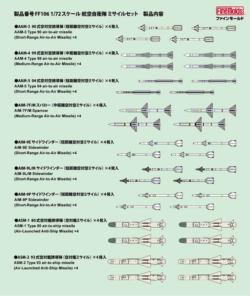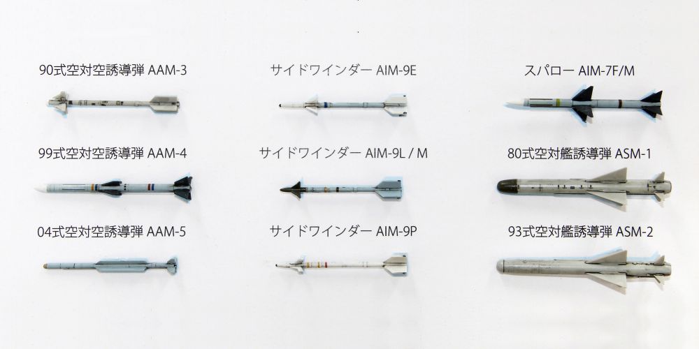 本キットの内容は、90式空対空誘導弾(AAM-3)、99式空対空誘導弾(AAM-4)、04式空対空誘導弾(AAM-5)、スパロー(AIM-7F)、サイドワインダー(AIM-9E、AIM-9L/M、AIM-9P)、80式空対艦誘導弾(ASM-1)、93式空対艦誘導弾(ASM-2)