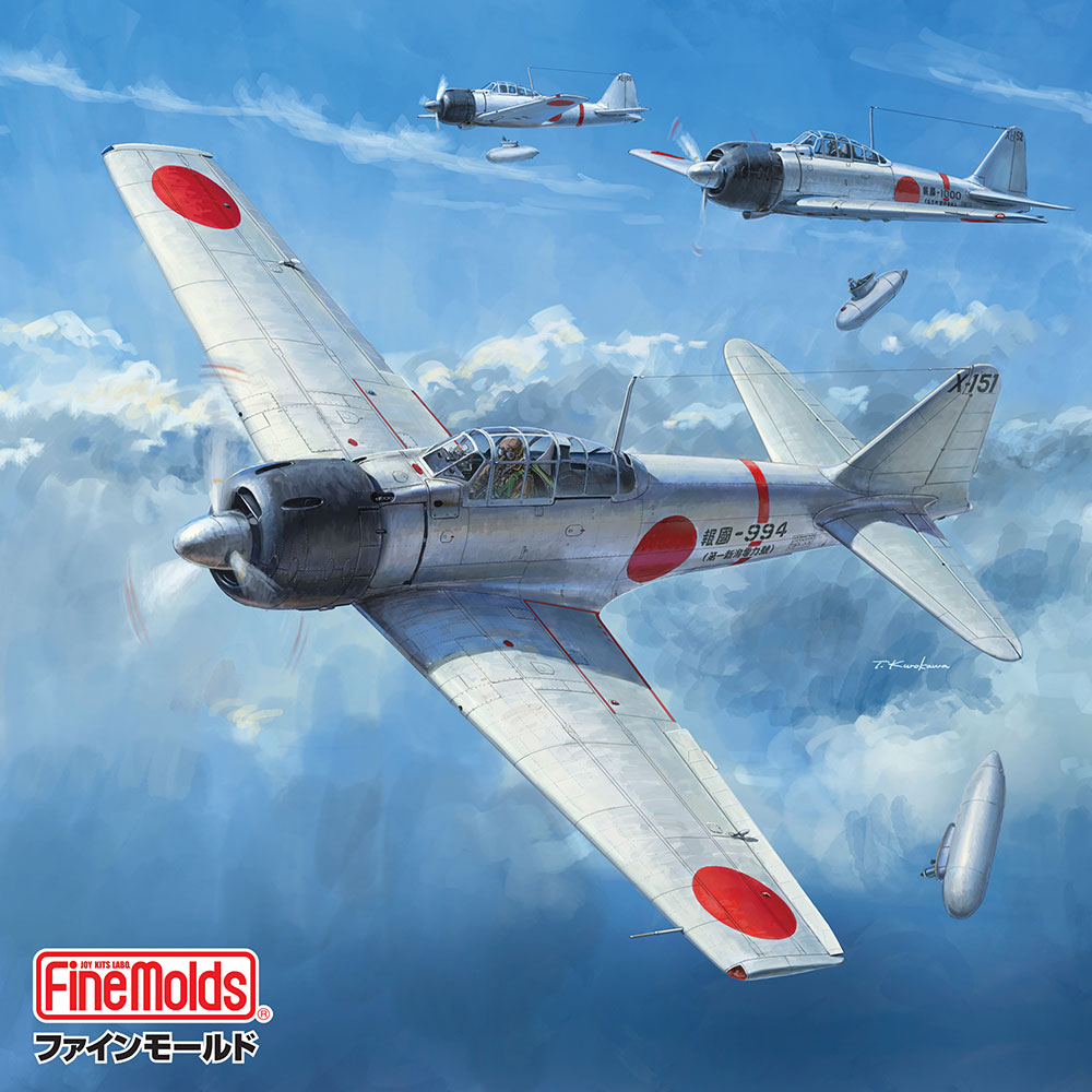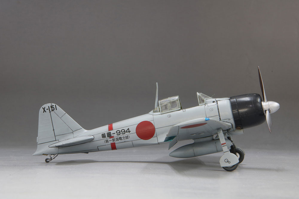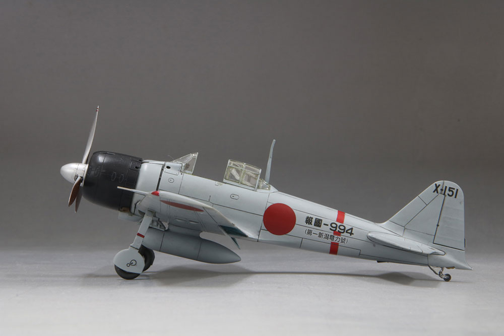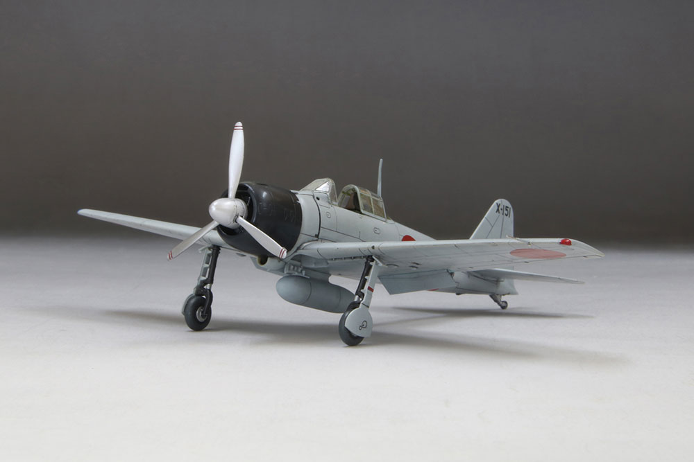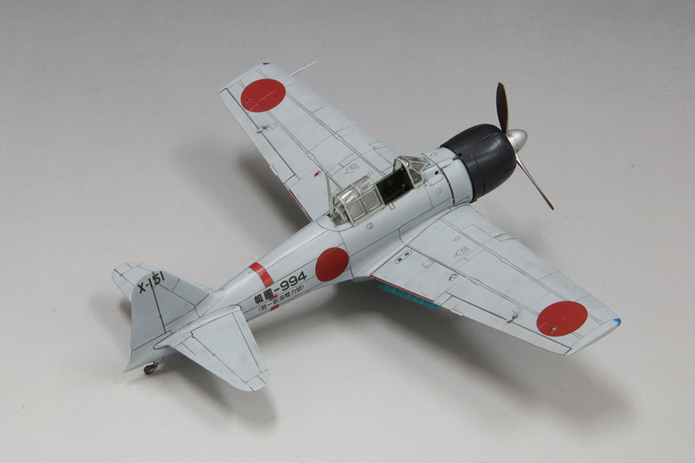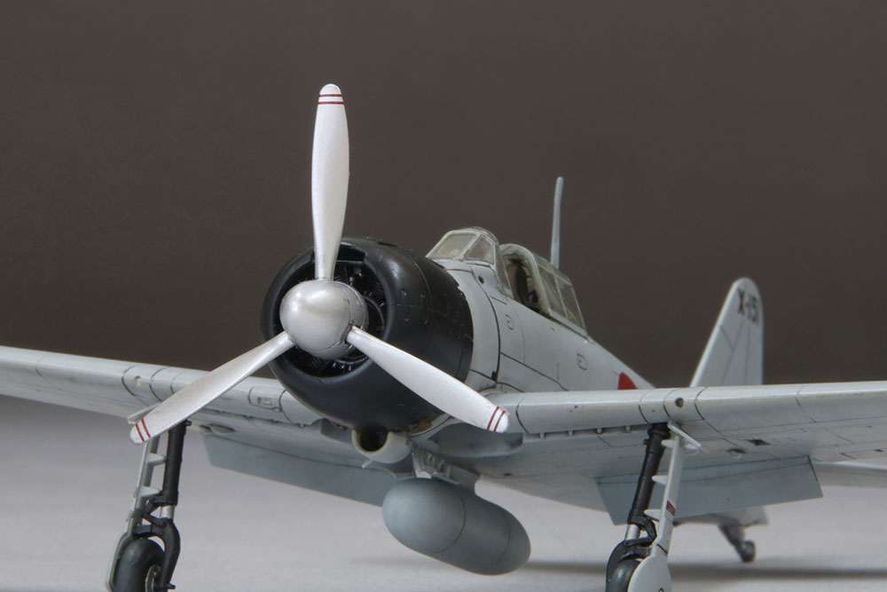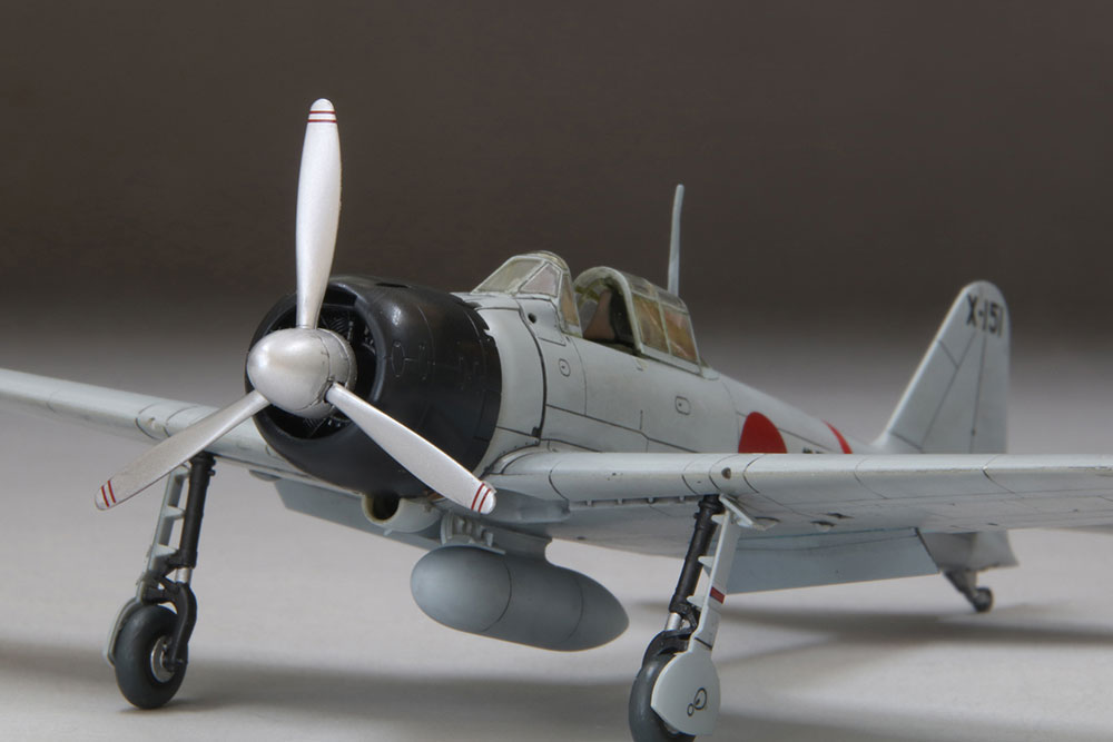 本製品では、胴体・翼・エンジン・プロペラをグレー、カウリング・脚部をブラック、機体内部は黄緑と3色に色分け成形。マーキングはガダルカナル/ニューギニアにて活躍し撃墜破30機を数えるエース『伊藤清』の乗機と、空母瑞鶴飛行隊所属機ほか、『ヒゲの羽切』と呼ばれたエース『羽切松雄』の機体のデカールを封入します。