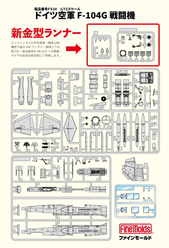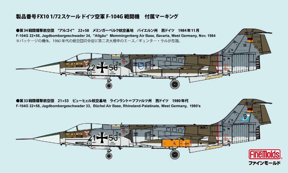 本キットではこの西ドイツ空軍が採用したF-104Gを再現しています。F-104Jとの違いとして、エンジンノズル形状変更、胴体上面と機首下面とにVHFアンテナを追加・胴体上下に航行灯装備・射出座席をMk.GQ7へ換装・タイヤの変更を新金型にて再現しました。マーキングは第33戦闘爆撃航空団(JaboG33)所属機、第34戦闘爆撃航空団(JaboG34)所属機が付属しています。