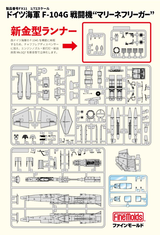 本キットではこの西ドイツ海軍が採用したF-104Gを精密に再現するべく、チャフフレアディスペンサーに加え、エンジンノズル・航行灯装備・Mk.GQ7射出座席を新金型で立体化。第1海軍航空団(MFG1)所属機と、第2海軍航空団(MFG2)所属機のマーキングが付属します。