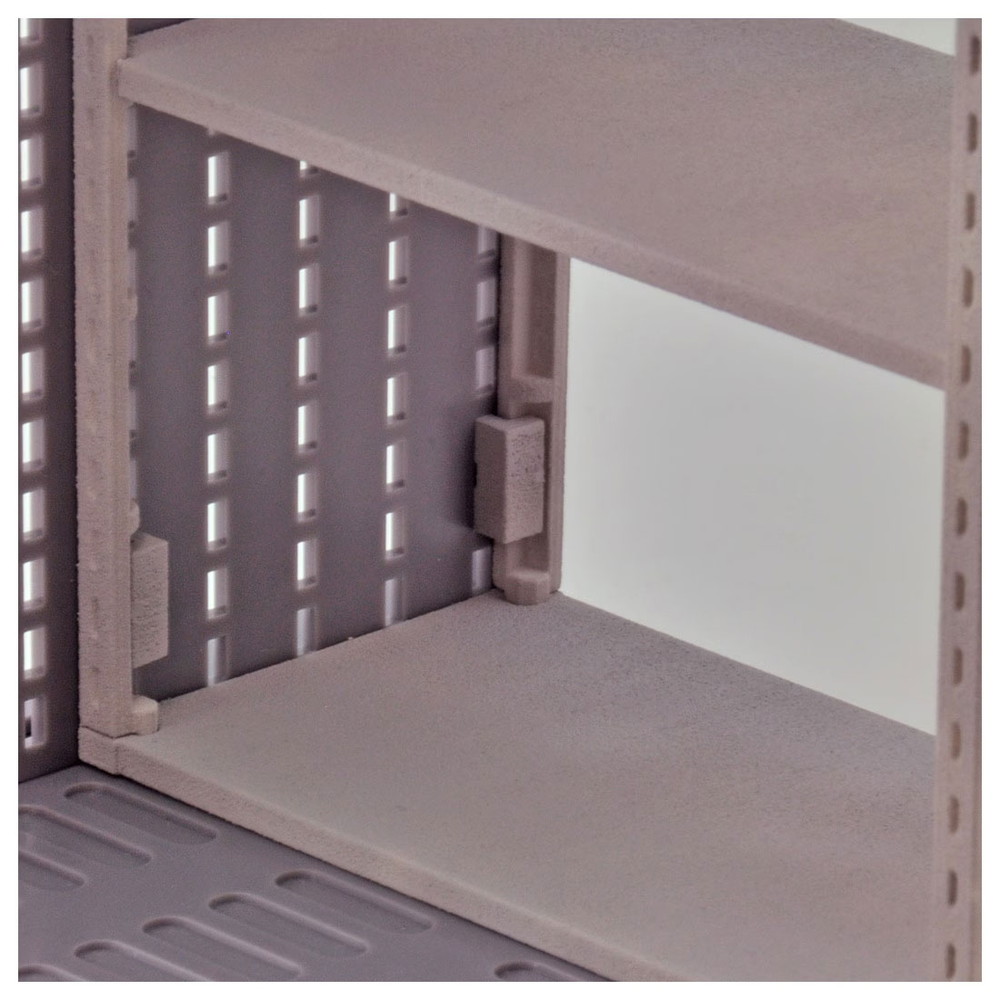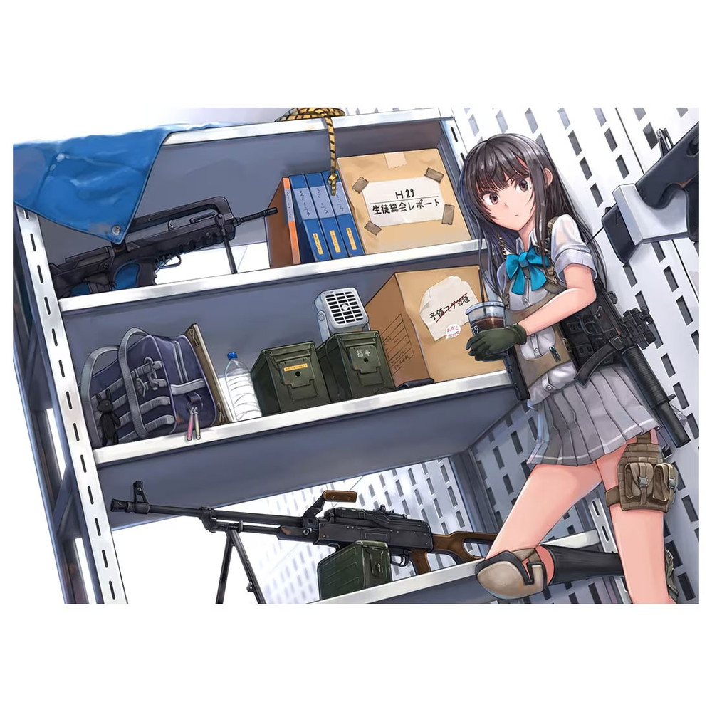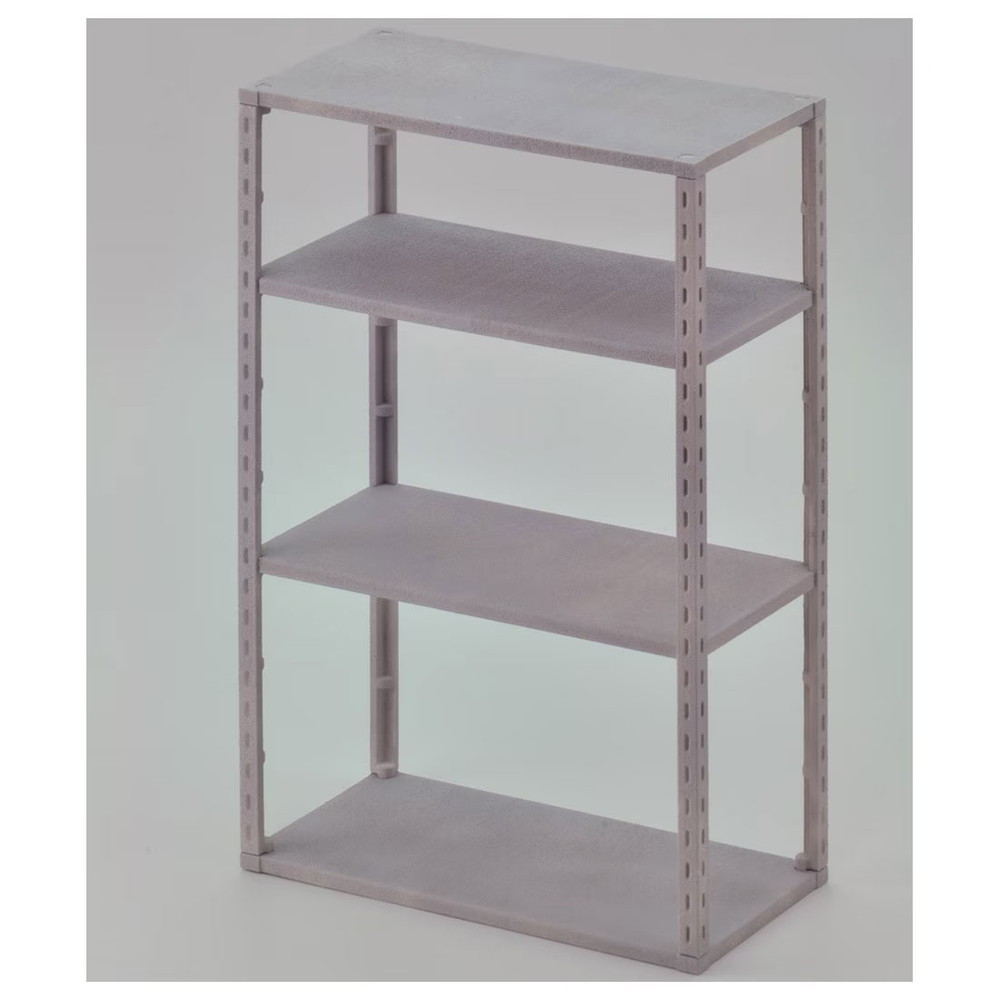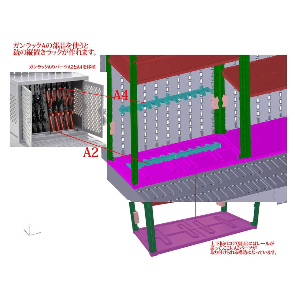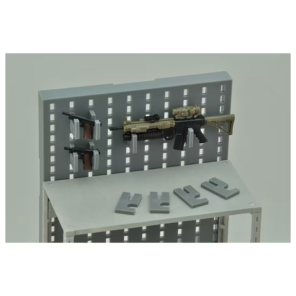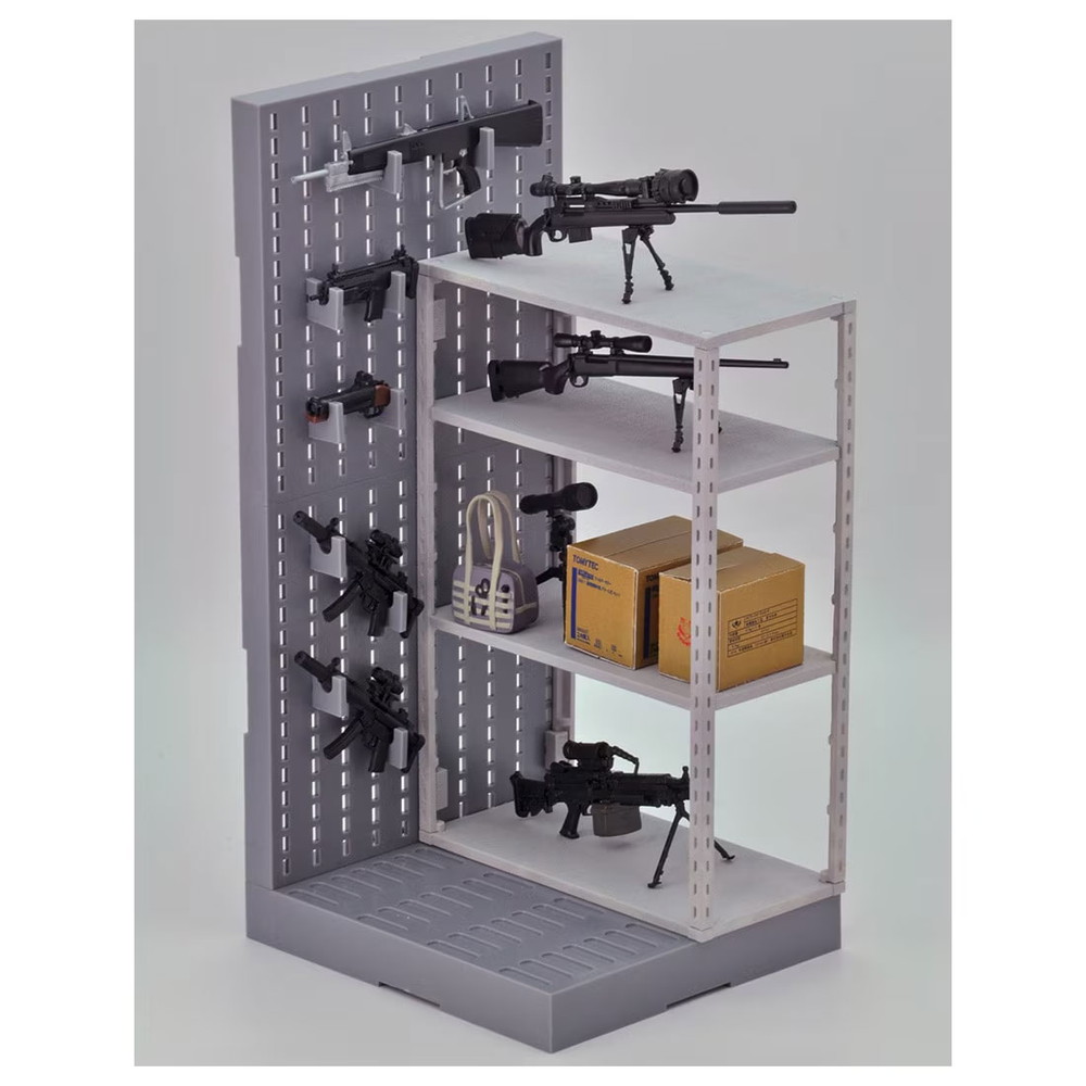 今作は壁面・床面に、スチール棚を加えた構成です。2脚付きの銃器や小物類をディスプレイに便利なアイテムとなっています。