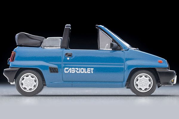 TLV-NEOシリーズでは2022年4月に登場し、好評をいただいたシティカブリオレに新仕様が登場。実車同様、ピラー付近に残るロールバーや、全開状態のサイドウィンドウの表現にもご注目ください。日本車では珍しい4人乗りオープンのオープンボディで、よく見える内装も極力再現。実車のボディカラーは12色が用意されましたが、今回は深みのあるブルーで、サイドのCABRIOLETデカールも印刷で再現しています。40年前の夏にタイムスリップしましょう。