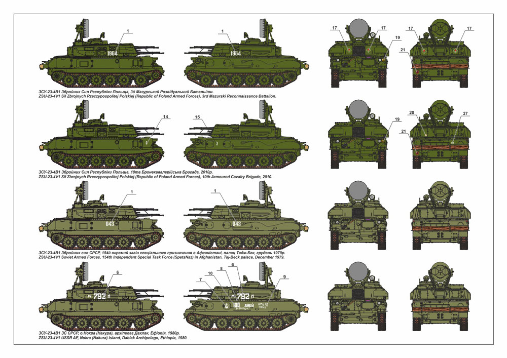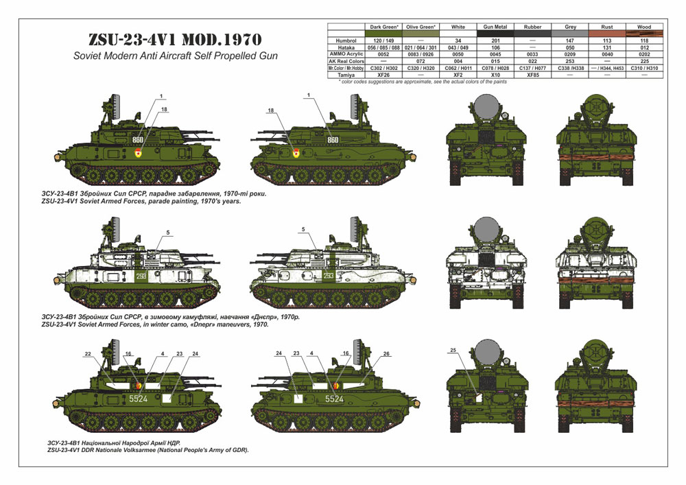 機械化部隊の低空防空や地上攻撃などの自走車両として1958年より開発が始まった対空自走砲です。1964年に採用されレーダーシステムと連動する23mm4門の威力で低空飛行の敵機の大きな脅威となりました。ZSU-23-4V1は1972年に開発された発展型で射撃管制装置とエンジンが改良されています。