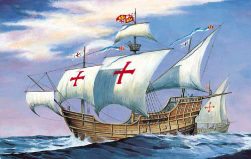 コロンブスのアメリカ大陸発見航海の旗艦です。ニーナ号・ピンタ号がキャラベル船ながら、サンタマリア号はキャラック船でコロンブス艦隊最大の船でした。