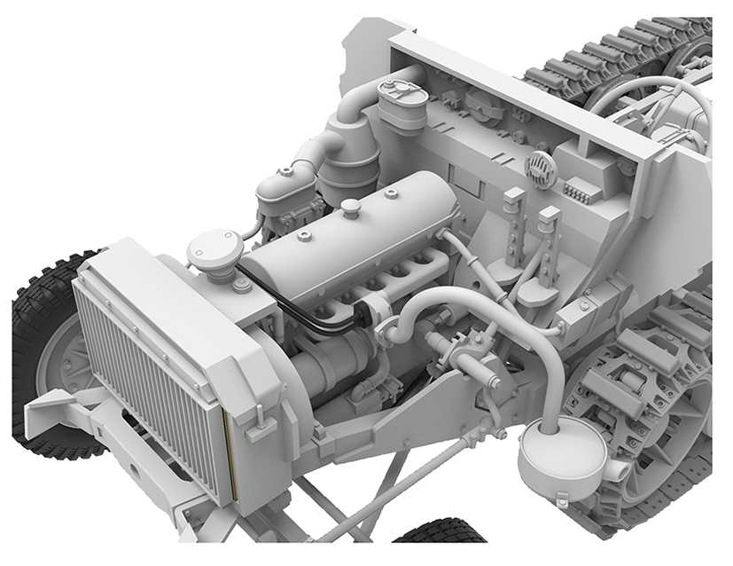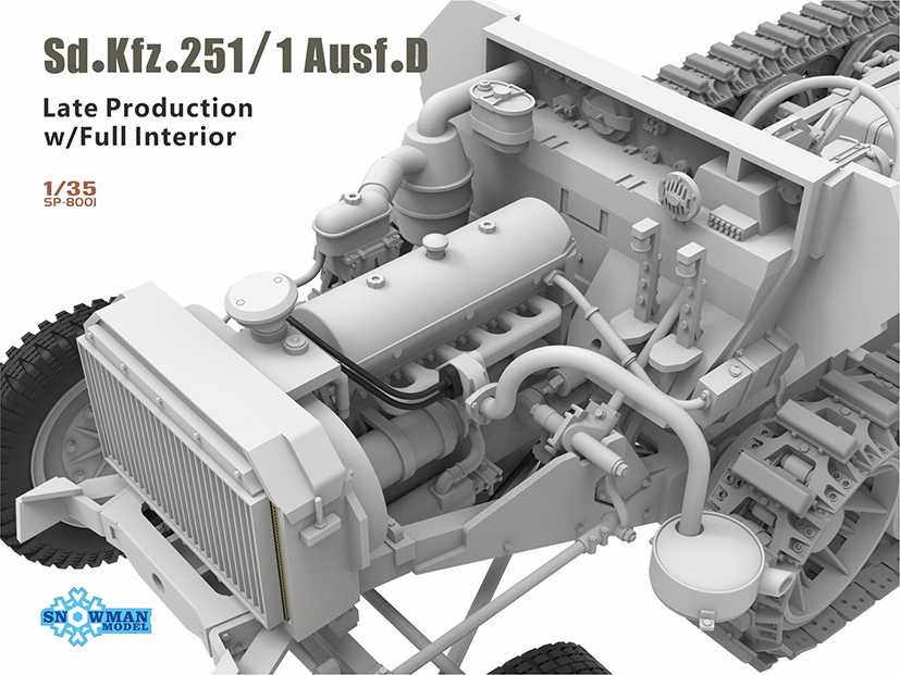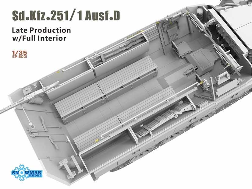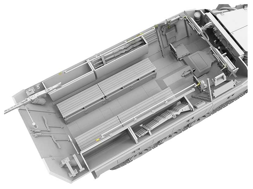 ■ドイツ軍主力の装甲兵員輸送車の大戦後期車両。エンジンをはじめサスペンション走行装置、室内を含めたインテリアをデザイン化したフルモデル。7ランナーにラバー製前輪タイヤ、金属製車間表示棒、細部はエッチングパーツを使用。履帯の装着は可動式を採用。デカールは4タイプの車両マーキングと細部のステンシル。増加装甲用のスペアロードホィールなどのアクセサリーも充実。