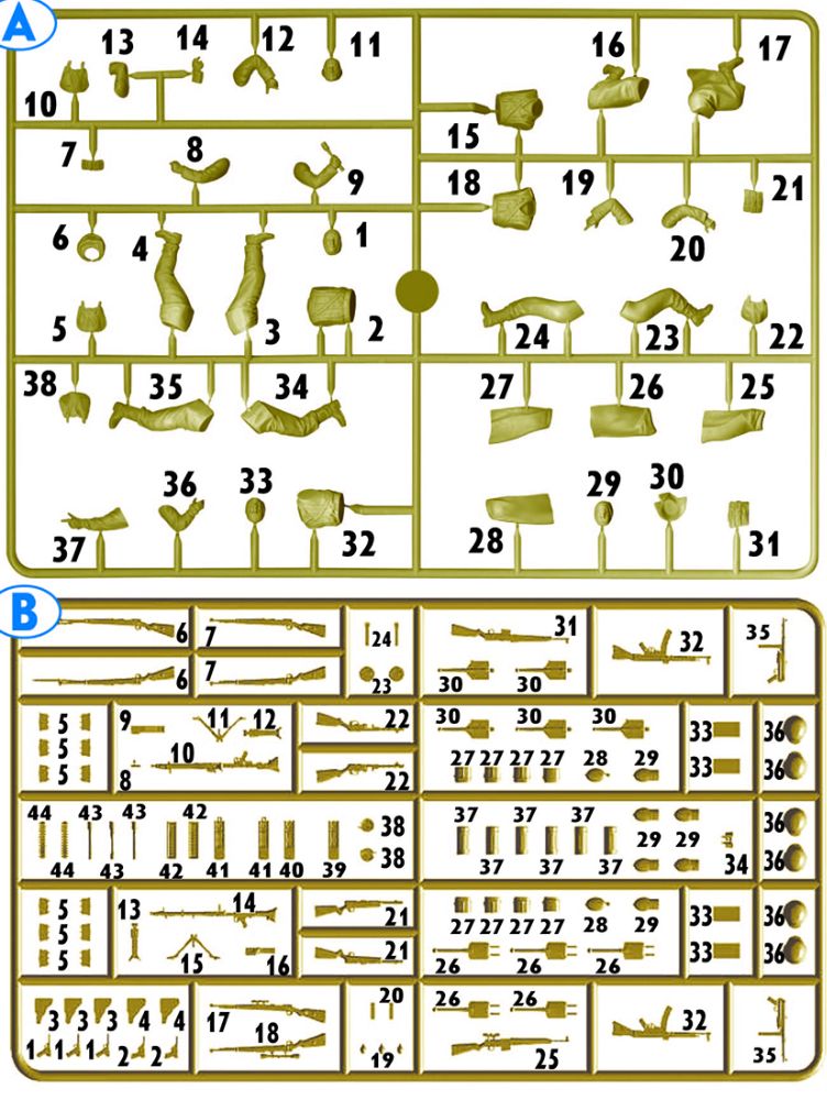 キットには2枚のプラスチック製ランナーが含まれています。1枚は米空挺兵と激しい戦闘を繰り広げたドイツ歩兵4体を組み立てるためのもので、もう1枚には武器や装備が収められています。