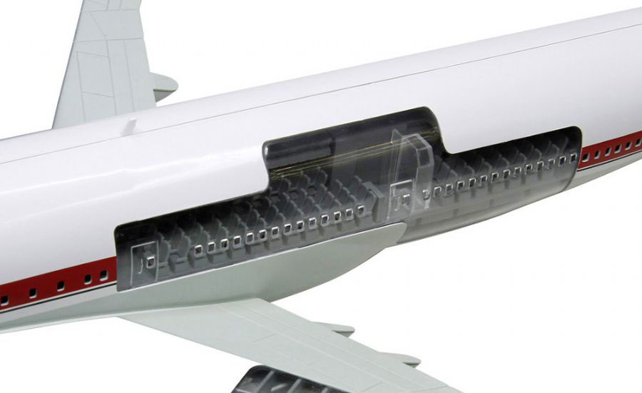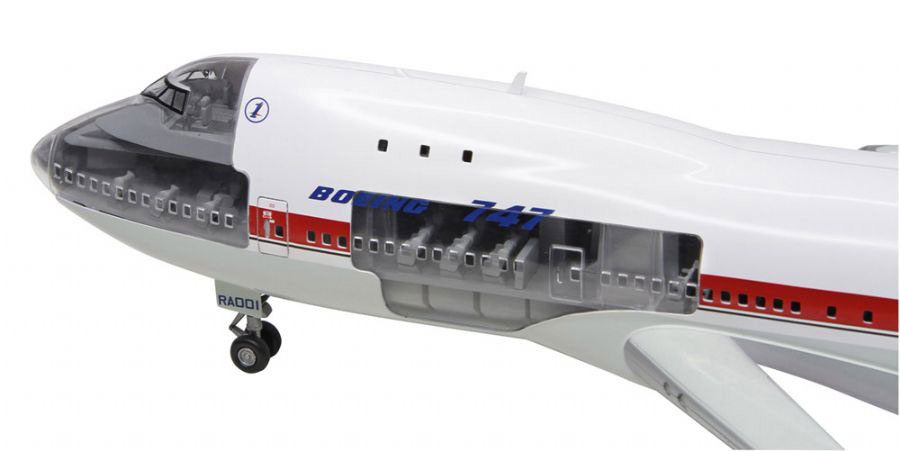 ボディから覗く室内にはずらりと並んだ座席が、コクピットには操縦席が、エンジンナセルにはエンジンの内部構造が、さらに、主翼、水平尾翼には内部に梁などの構造物が再現され、興味深い仕上がりです。
