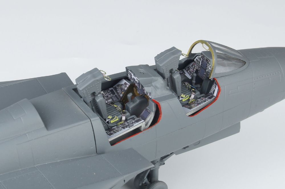 別に用意されている専用エッチングパーツセットのコクピット用と外装用を一緒にセット。別々にお求めいただく面倒もなく、お値段もお得なのがポイントです。脚収納庫内部のディテール、エンジン後部の排気口内部をディテールアップするパーツなどの外装パーツとカラーエッチングでメーターをプリント済み計器パネルやサイドコンソール、シートベルト類などのパーツが用意されたコクピット用をセット。機体は仕上がり全長約390mm。F-14ならではの特徴ある可変翼は組み立て後も可動。さらに、脚の繊細な表現や脚格納スペース内のディテール、さらに、コクピットの再現など、1/48スケールでF-14トムキャットの魅力を再現しています。マーキングは厚木基地に展開して日本の航空ファンにもおなじみだったCVW-5所属機から2つのマーキングを収録。
