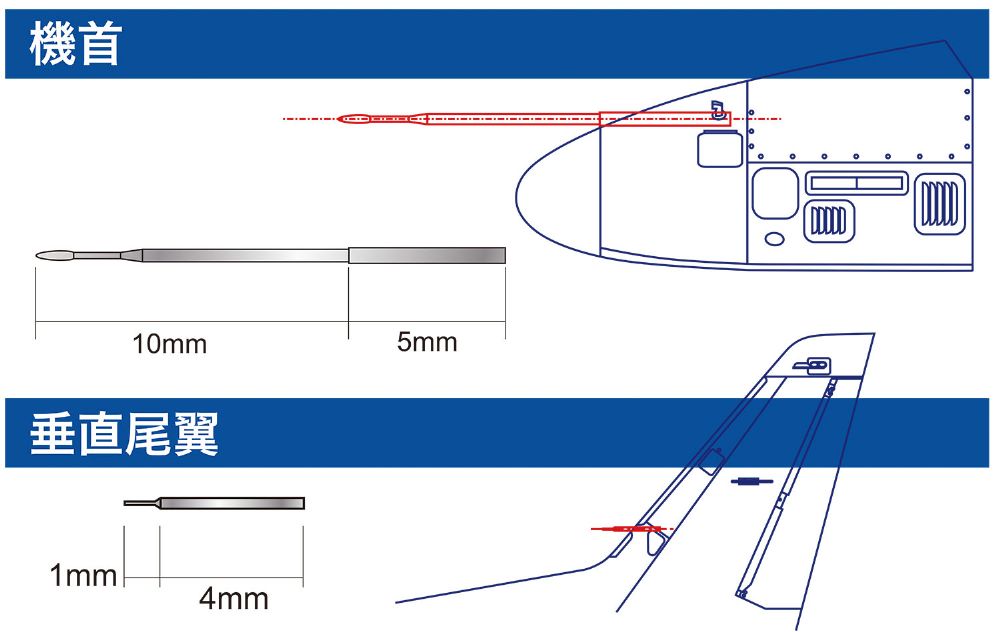 ●キットの機首と垂直尾翼に装備されているピトー管を金属で再現