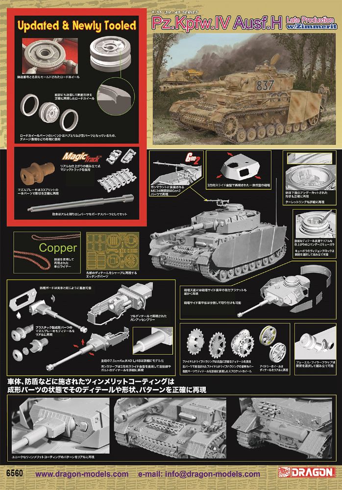 第二次世界大戦で活躍したドイツ軍の主力戦車、IV号戦車のH型を再現。モデルはH型の後期生産型を1/35スケールでモデル化、しかも車体には磁気吸着地雷除けに施されたツィンメリットコーティングを施した状態を再現しています。コーティングのパターンがしっかりと表現された車体や砲塔は質感あふれる仕上がりが魅力。加えてこのキットでは履帯にマジックトラック、砲身にはアルミ砲身パーツ、さらにマズルブレーキには3Dプリントパーツを用意。仕上がりのリアリティを高めています。車体下部や砲塔はスライド金型を使用して形状を正確に再現。リーフスプリングのサスペンションも再現された足回りは詳細なディテールも表現された転輪パーツでマジックトラック履帯とともにリアルな仕上がりを演出します。加えて砲塔もスライド金型で形状を正確に再現。キューポラに取り付けられる対空機銃にはリアルな再現で定評あるドラゴンのGen2タイプのMG34機銃部品をセット。さらに、H型では標準装備となったシュルツェンもしっかりとモデル化。第二次大戦後期の情景製作やIV号戦車コレクションに欠かせない1台です。