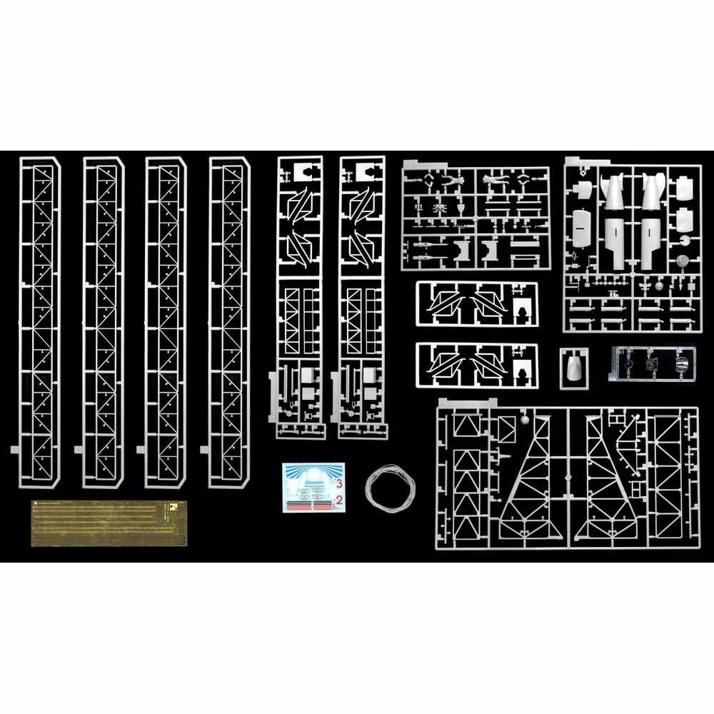 発射台、ランチャータワーは複雑なフレームの構成をプラスチックパーツとエッチングパーツの組み合わせで再現。仕上がりの高さは42cmにも達し、メカニカルな存在感も十分です。機体は太い胴体に短い主翼、十字の尾翼を装備した特徴あるスタイルをリアルに再現。4基の離陸用ブースターロケットももちろんモデル化しています。
