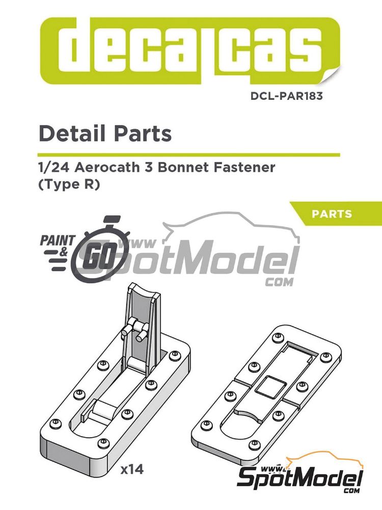 このセットは1/24スケールと1/25スケールのカーモデルキットに幅広く使っていただけるボンネットファスナーを再現したディテールアップパーツのセットです。パーツはレーシングカーに使われている長方形のエアロキャッチ3型タイプのボンネットファスナーを再現しています。3Dプリントパーツでディテールを詳細に再現。セットには開いたラッチのパーツと閉じた状態のラッチのパーツがそれぞれ14個づつ入っています。また、このパーツをモデルに取り付けるときに便利な開ける穴を加工するときのテンプレートも用意されています。