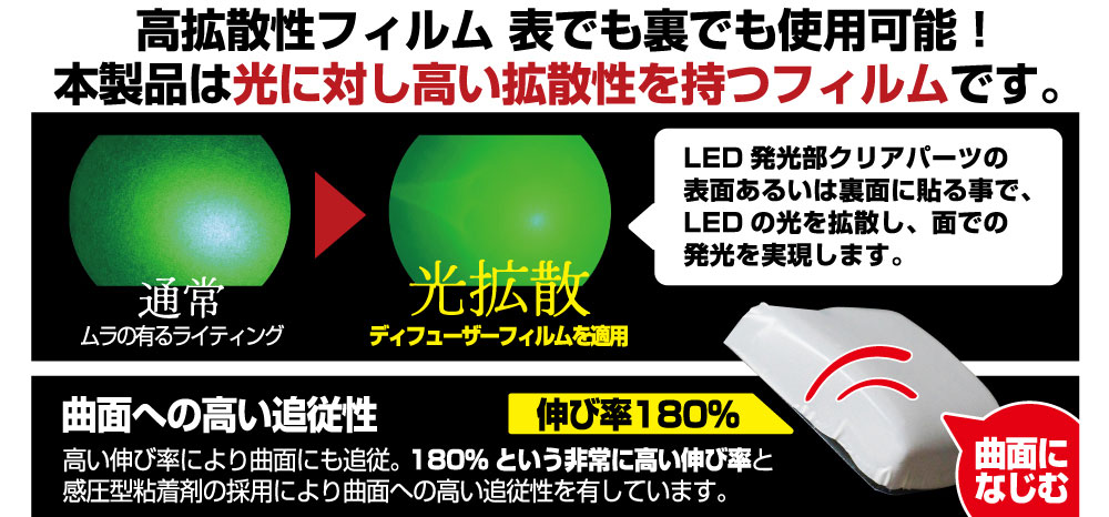 本製品は光に対し高い拡散性を持つフィルムです。LED発光部のクリアパーツ表面あるいは裏面に貼ることで、LEDの光を拡散し面での発光を実現します。