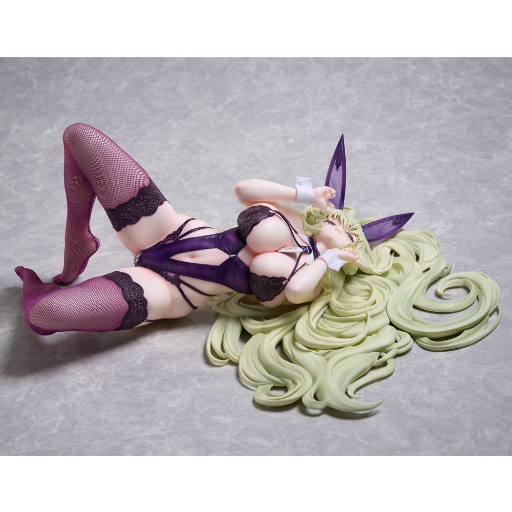 艶やかなパープルを基調としたバニーガール衣装は、胸元や腰回りのストラップ、レースのディテールまで作り込みを行いました。加えて本アイテムでは専用カラーの網タイツを使用し、質感もしっかりと再現。流れるように広がるロングヘアも、軽やかなグラデーション塗装と立体的な造形により、躍動感あふれる仕上がりです。