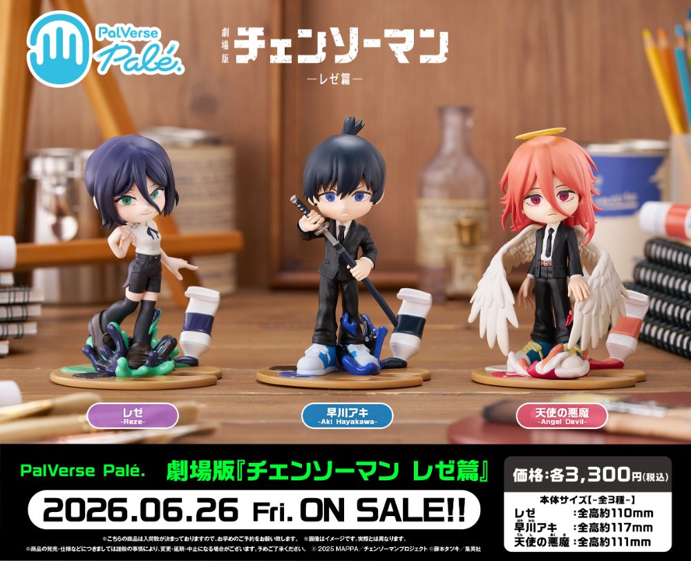 ブシロードクリエイティブがおくるパレットから生まれるアメリカンアニメーションのようなデフォルメデザインが特徴のオープンフィギュアシリーズ「PalVerse Palé.」に劇場版『チェンソーマン レゼ篇』のレゼ、早川アキ、天使の悪魔の3名が登場!