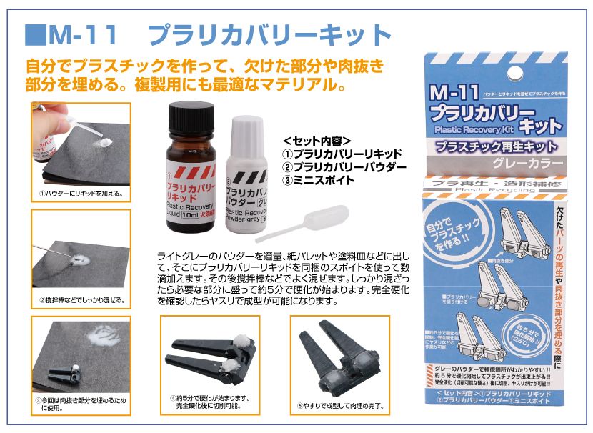 ●付属のパウダーとリキッドを混ぜることで欠けたパーツの再生や肉抜き部分を埋めることができる補修キット。