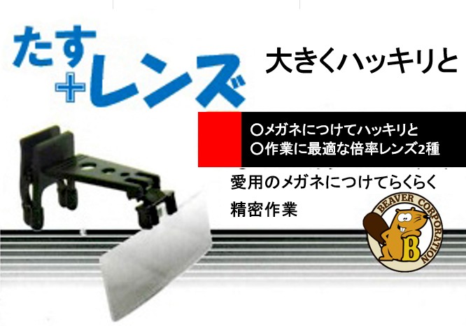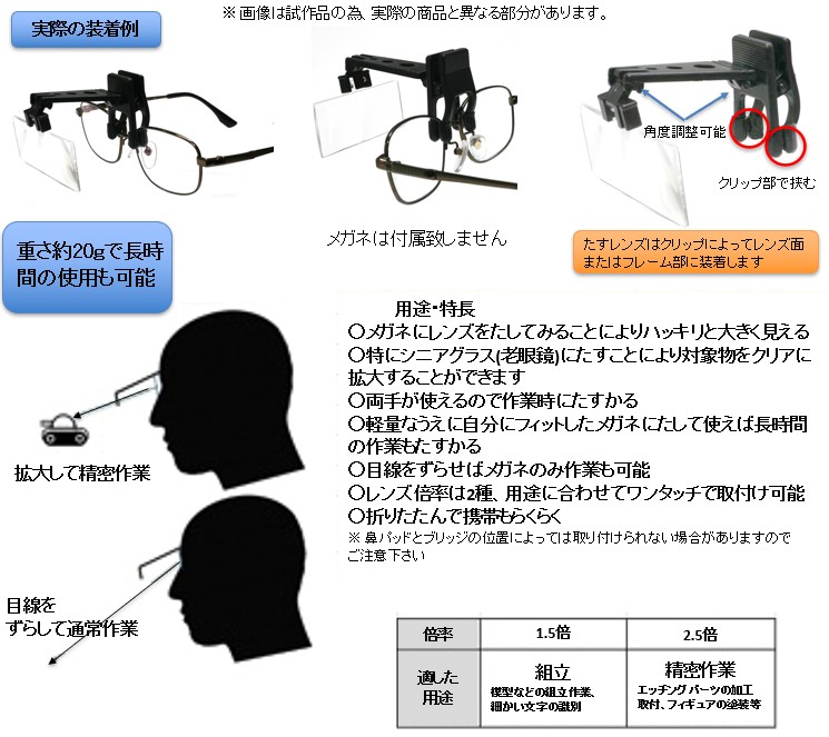 「たすレンズ」は現在ご使用のメガネに装着して使用します。お客様用に調整されたメガネを通して「たすレンズ」で対象物を拡大します。この為、歪みも少なく、立体感を損なわず対象物をクリアに拡大できます。軽量な上に自分にフィットしたメガネに装着しますので、圧迫感が少なく負担の少ない長時間の作業が可能となります。両手を自由に使えるため、模型等の精密作業に最適なのは勿論のこと、スタンドタイプのレンズと異なり場所を選ばず使用できます。