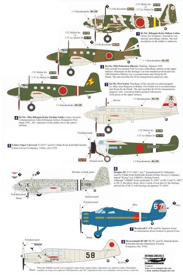 - 8種マーキング:立川 一式双発高等練習機丙型 x 4、フォッカースーパーユニバーサル、DC-2、ビーチクラフトC-17E、Bf108 x 各1 ※立川 一式双発高等練習機は国籍マーク2機分