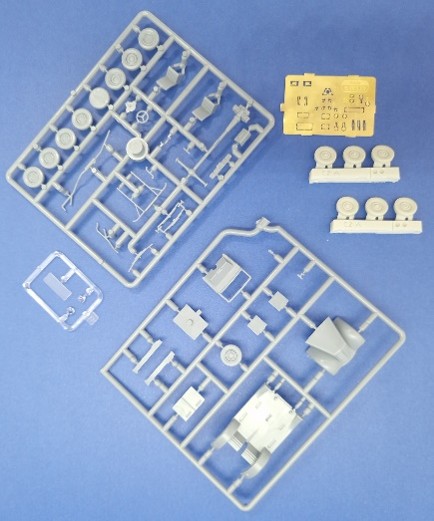 - インジェクションプラスチックパーツにレジン製ホイールとエッチングパーツ、2種デカールが付属しています。