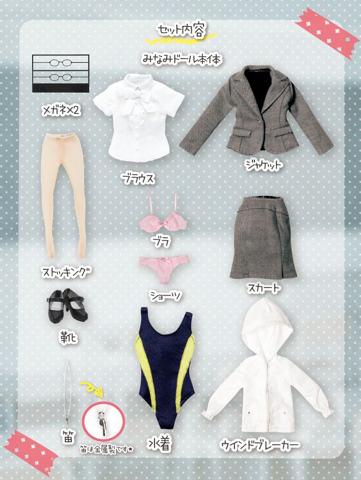 - 【セット内容】みなみドール本体、ジャケット、ブラウス、スカート、ブラ、ショーツ、ストッキング、靴、ウィンドブレーカー、水着、笛、メガネ×2