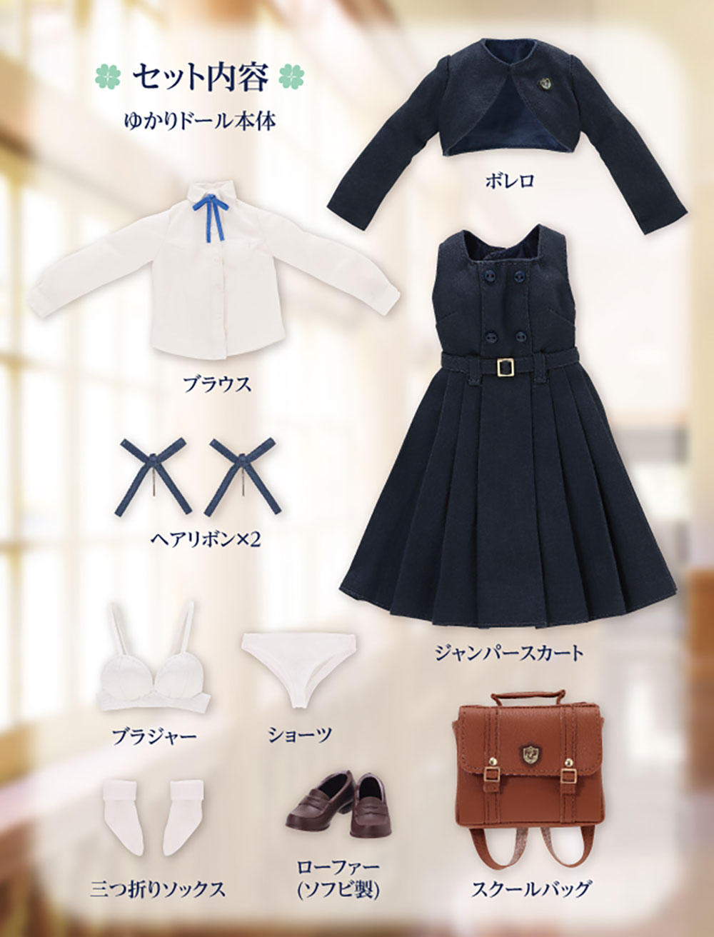 - 【セット内容】ゆかりドール本体、ヘアリボン×2、ブラウス、ジャンパースカート、ボレロ、ブラジャー、ショーツ、三つ折りソックス、ローファー(ソフビ製)、スクールバッグ