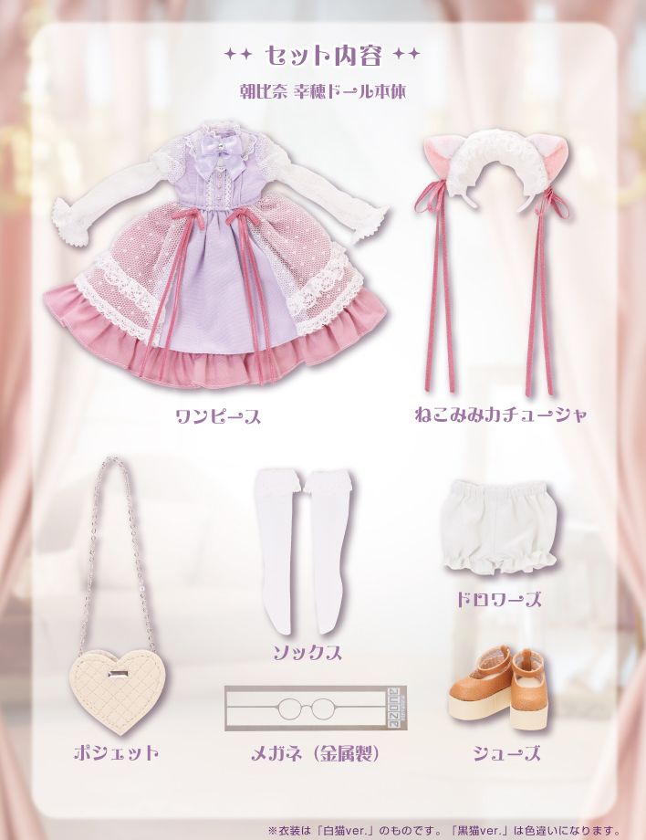 - 【セット内容】朝比奈 幸穂ドール本体、ねこみみカチューシャ、ワンピース、ドロワーズ、ソックス、シューズ、ポシェット、メガネ(金属製)