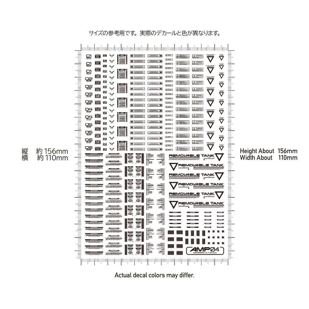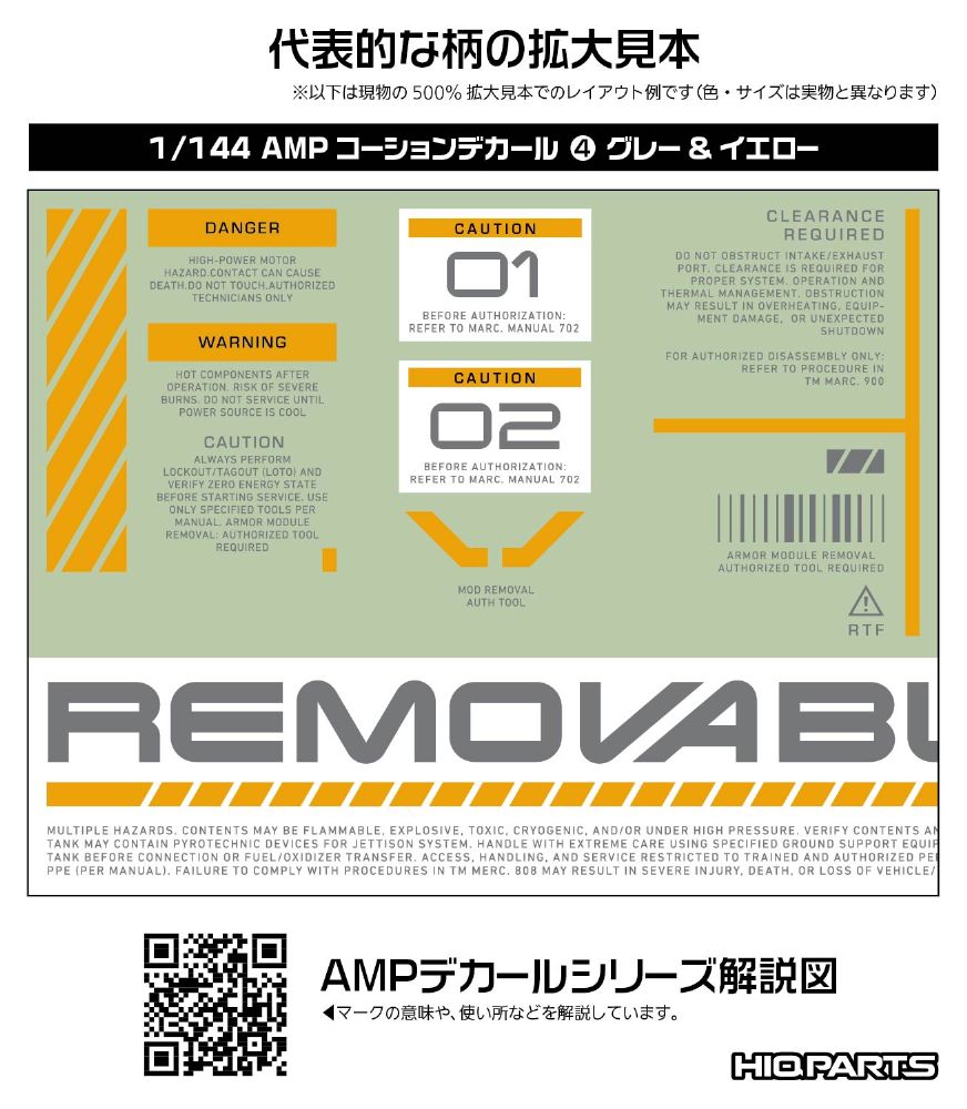 メカモデル向けの水転写式汎用コーションデカール「AMP」は、近年の細分化されたメカモデルのパーツ割に対応するため、デザインを刷新した新シリーズです。装飾を削ぎ落としたスタンダードなデザインが中心で、作品の精密感と情報量を高めます。ある程度の可読性を確保しているため、ブログの文字解説を参考に、最適な貼り付け場所を選定してください。