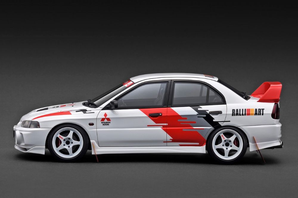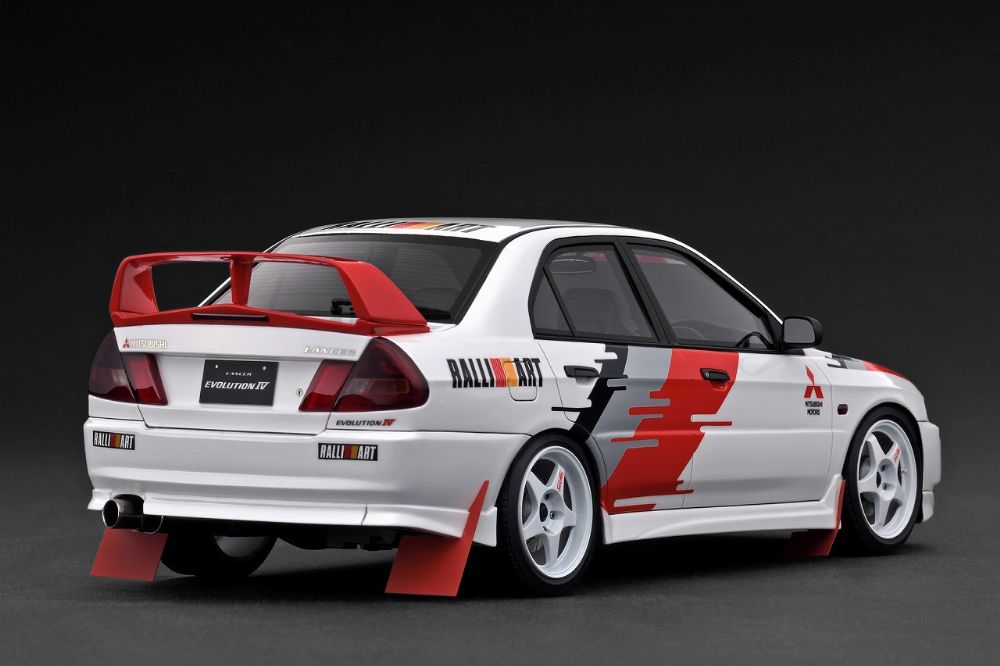 「LANCER EVOLUTION Ⅳ (CN9A) 」を1/18スケールレジンモデルで再現。ボディカラー:ホワイト。OZクロノタイプ17インチホイール(ホワイト)にローダウン仕様。純正エアロパーツ(フロントバンパー、リップスポイラー、サイドステップ、リヤスポイラー)、純正フォグライトカバー、マッドフラップ、大径シングルマフラー、大型ブレーキキャリパー(レッド)、ボディ各所に「RALLYART」ロゴ&デザイン、純正レカロシート、MOMOタイプステアリングを装着。