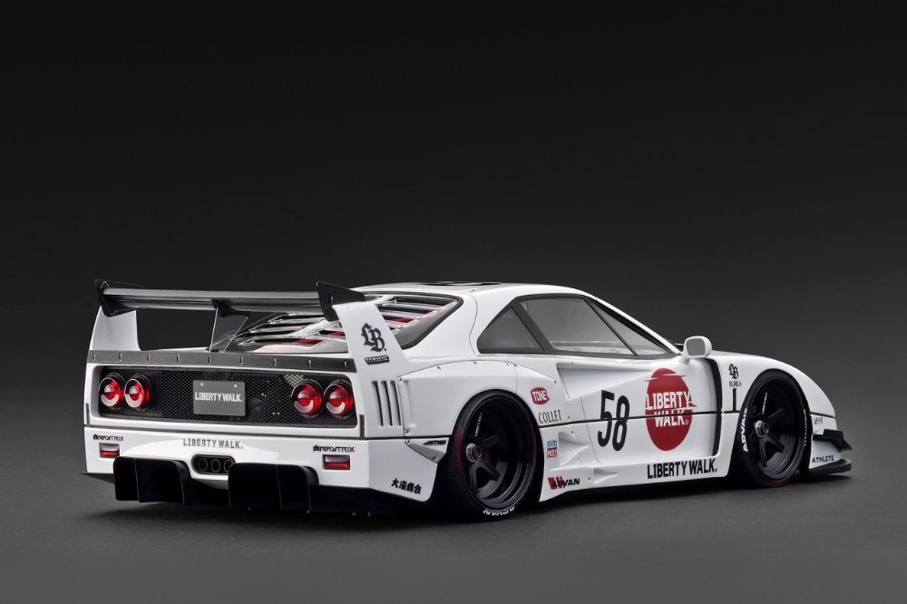 最新仕様のリバティウォークのデモカー「LB-WORKS 40」を1/18スケールレジンモデル素材でモデル化しました。ボディカラー:ホワイト。LB-worksオリジナル6本スポーク18インチホイール(ブラック)に専用ボディキット(フロントリップスポイラー、フロントカウル、リヤワイドフェンダー、リヤウィング、リヤディフュ—ザー、カナード)、ボディの各所に専用デカール、内装に専用バケットシート、LB-worksオリジナルステアリング、ロールバーを装着。リヤハッチの内部に収まるV8ツインターボエンジンを詳細に再現しました。