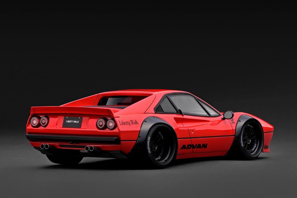 リバティウォークのデモカー「LB-WORKS 308」を1/18スケールレジンモデル素材でモデル化しました。ボディカラー:レッド。LD97 LD-12タイプ18インチホイール(ブラック)に専用ボディキット(フロントバンパー、前後オーバーフェンダー、リヤウィング)、ビタロー二タイプサイドミラー、レッドキャリパー、ボディの各所に専用デカール、オリジナルステアリング、ノーマルシート、4本出しマフラーを装着。