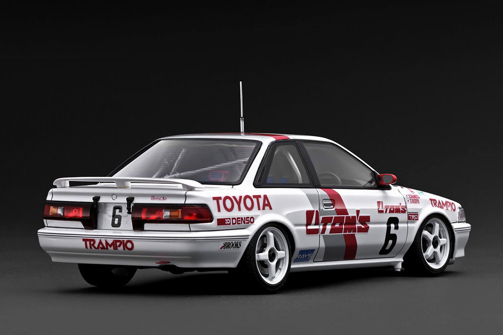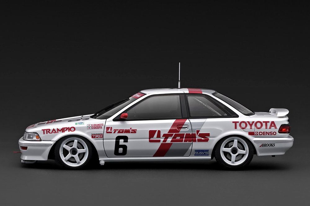 1991年のJTC(全日本ツーリングカー選手権)参戦した「トムスカローラ 6号車」を1/18スケールレジンモデルで再現RAYSレーシングタイプ(フロント:5本スポーク/リヤ:4本スポーク)15インチホイール(ホワイト)を装着。実車(周型車)の3Dスキャン取材から内外装、ボディのマーク領に至るまで細部を詳細に再現しました。※画像は試作品です。