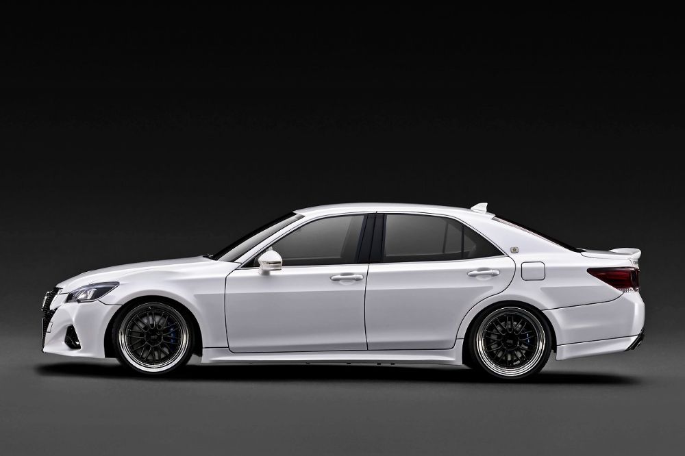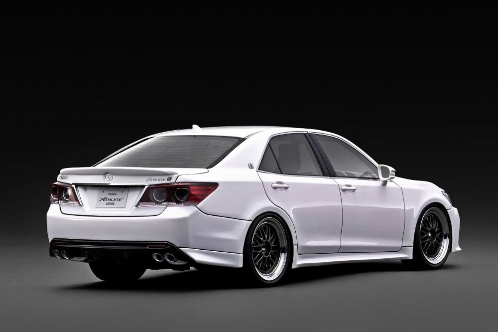 「Crown Athlete S (GRS214) 」を1/18スケールレジンモデルで再現。ボディカラー:パールホワイト。内装カラー:ブラック。BBS LMタイプ19インチホイール(ポリッシュ&ガンメタリック)にローダウン仕様。トランクスポイラー、左右4本出しマフラー、大型ブレーキキャリパー(ダークブルー)、ルーフアンテナ、純正シート、純正ステアリングを装着。