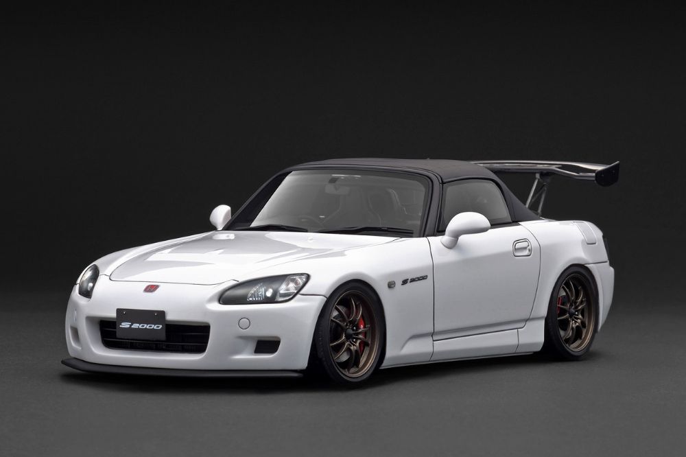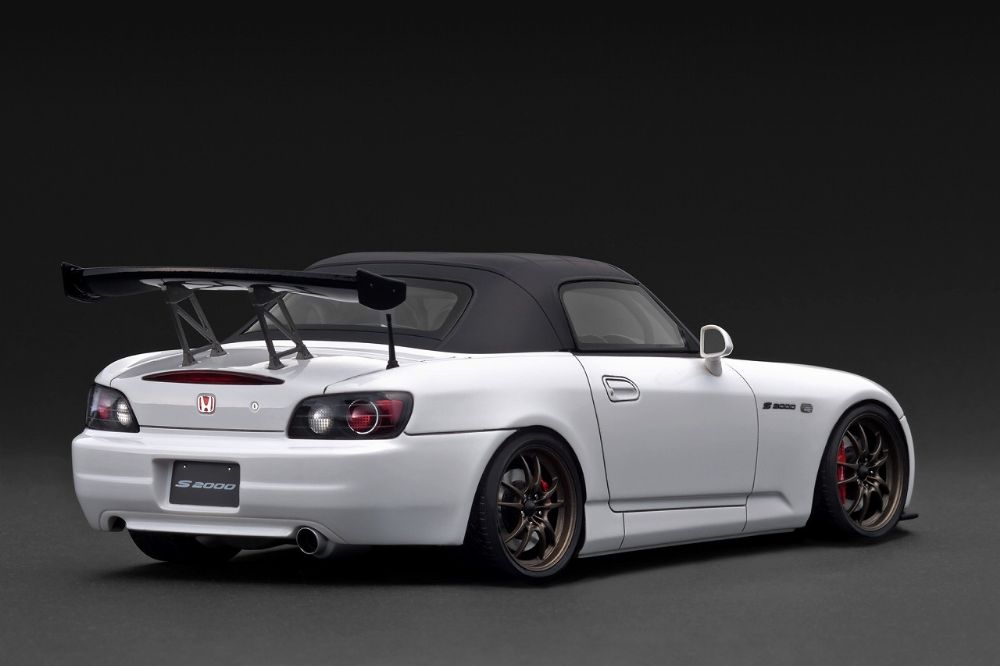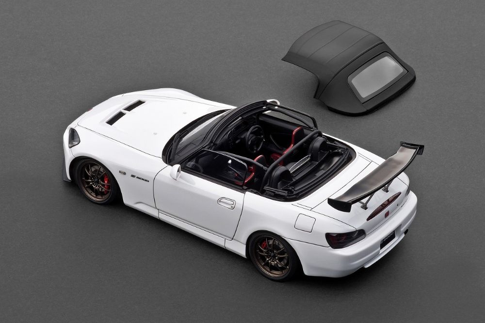 「S2000 (AP1)」を1/18スケール レジン素材でモデル化。ボディカラー:ホワイト。MUGEN MF10タイプ17インチホイール(ブロンズ)にローダウン仕様。純正エアロパーツ(フロントリップスポイラー、サイドステップ)、GTウィング、レッドキャリパー、シングルマフラー、内装にレカロシート(ブラック)、6点ロールバー、MOMOタイプステアリングを装着。幌はマグネットで脱着可能なパーツを2種類準備。オープン&クローズの2つの仕様をお楽しみいただけます。