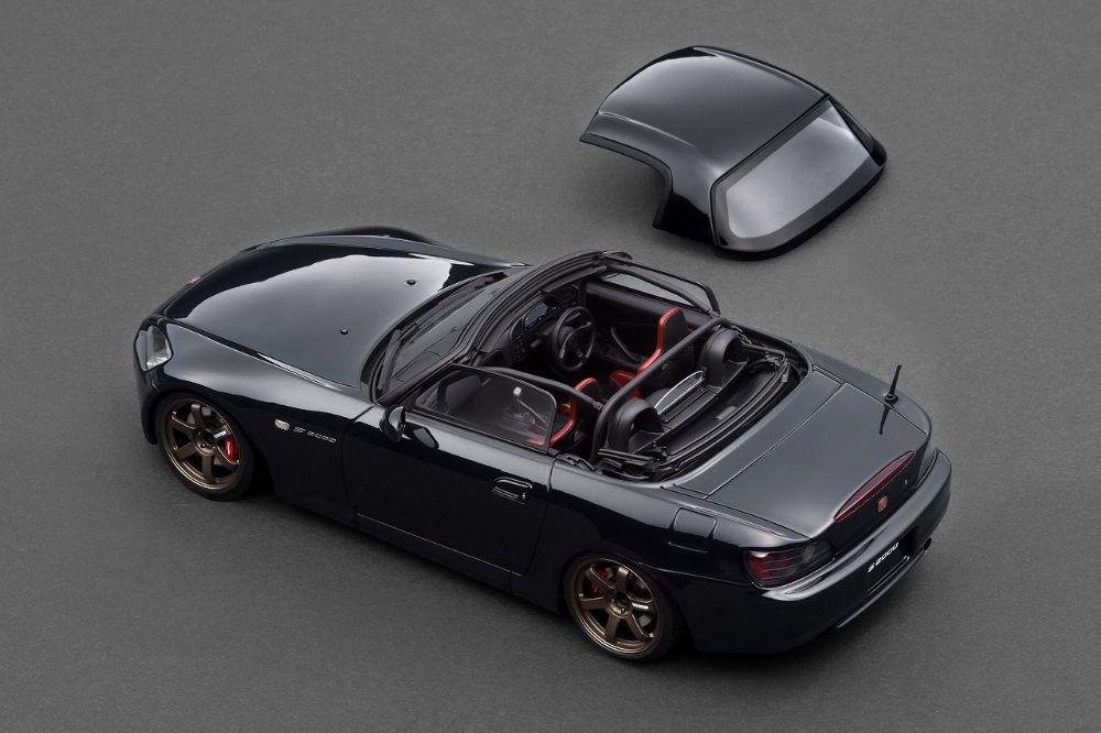 「S2000 (AP1)」を1/18スケール レジン素材でモデル化。ボディカラー:ブラック。TE37 タイプ17インチホイール(ブロンズ)にローダウン仕様。純正サイドステップ、レッドキャリパー、シングルマフラー、内装にレカロシート(レッド)、6点ロールバー、MOMOタイプステアリングを装着。ハードトップはマグネットで脱着可能なパーツを2種類準備。オープン&クローズの2つの仕様をお楽しみいただけます。