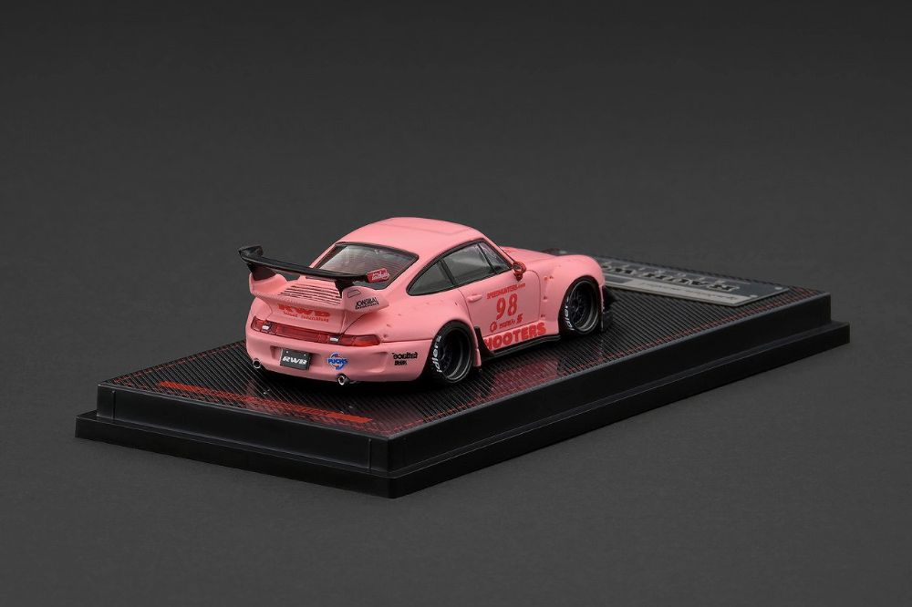 世界的に有名なマットピンクのデモカー「RWB 993」を1/64スケール ダイキャストモデルで再現しました。ボディカラー:マットピンク。WORKマイスターM1タイプ 18インチホイール(ブラック)装着。ワイドフェンダーにGT2タイプリヤウィング、フロントリップスポイラー、フロントフェンダーにカナード、フロントウィンドウ上部にRWBロゴ、左右ドアにゼッケン&専用ロゴ、バケットシート、専用ステアリング、ロールケージ、2本出しマフラーを装着。