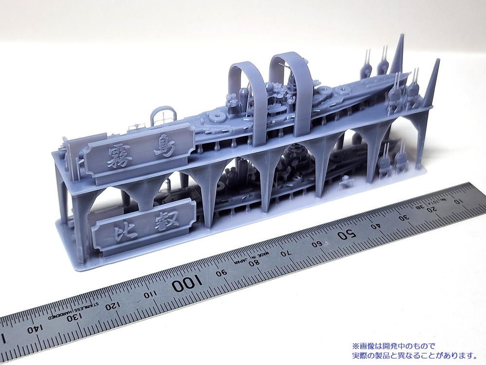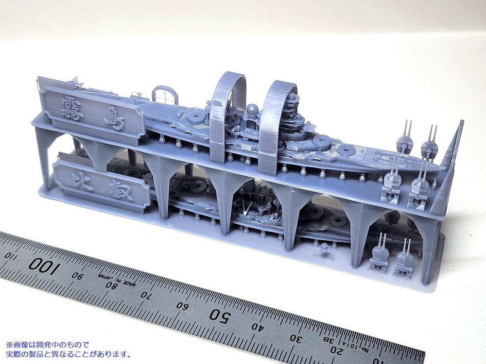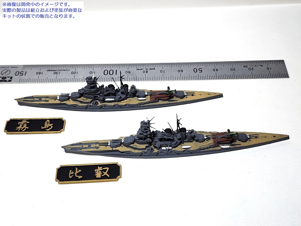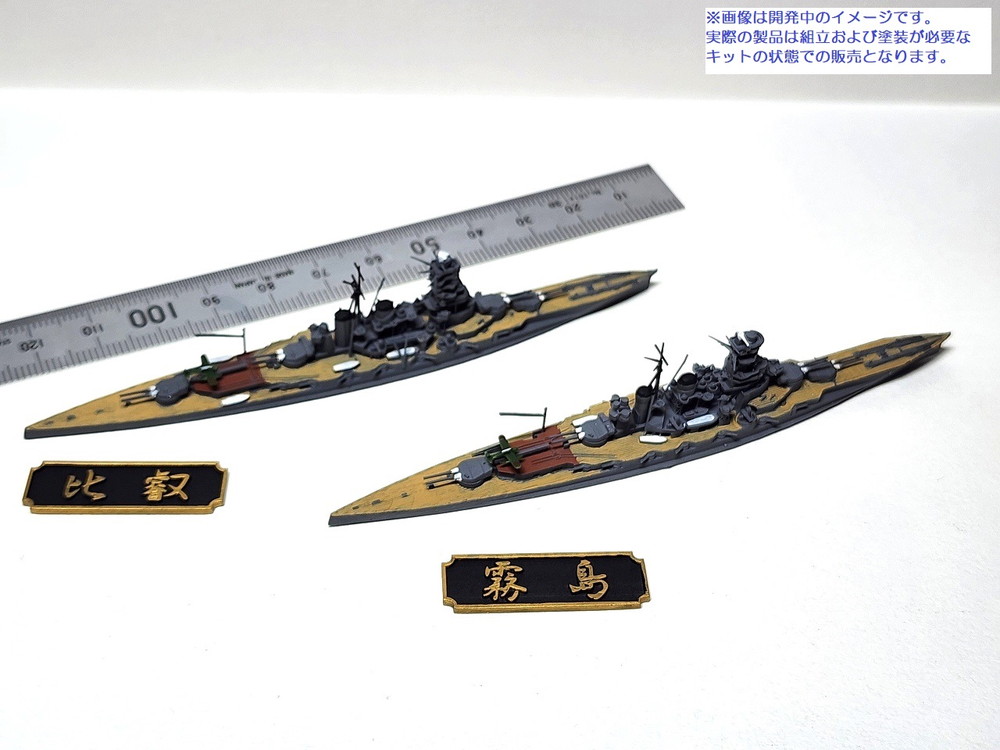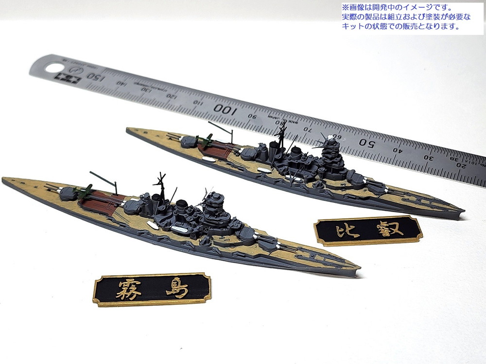 1/2000スケールの金剛型戦艦二番艦比叡および四番艦霧島で編成された第十一戦隊のセットです。精密に3Dプリントされた2隻の戦艦のウォーターラインモデルに艦名の銘板が付属します。