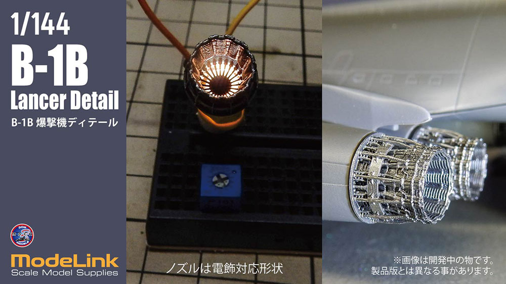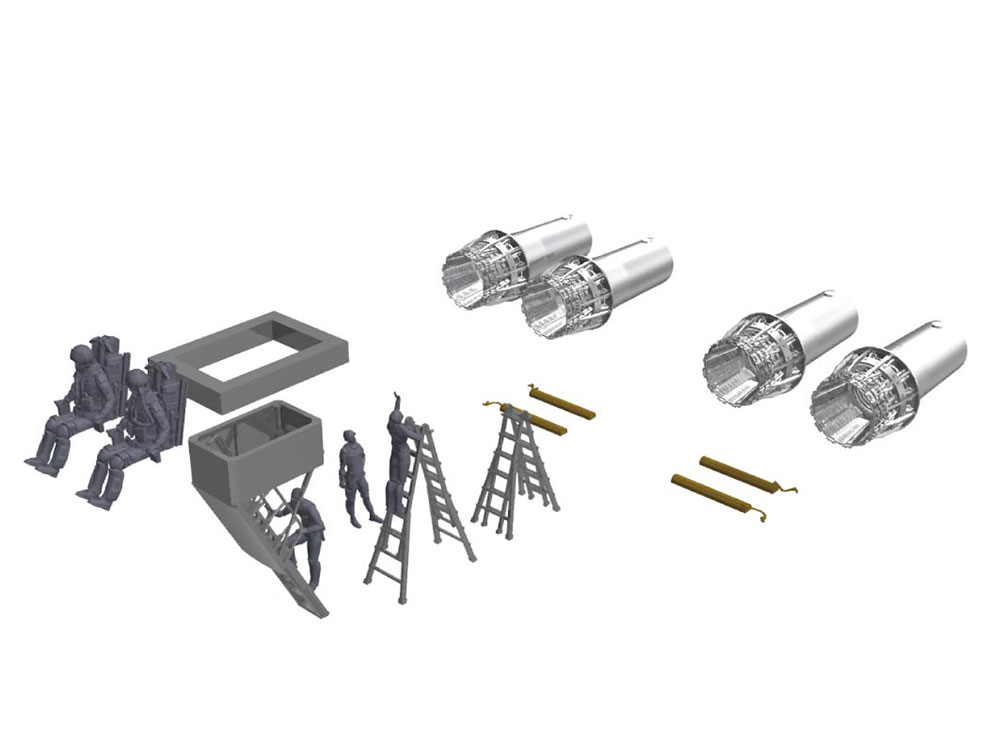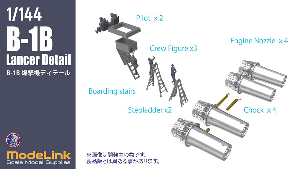 1/144のB-1B用ディテールパーツ。精密なノズルやパイロット、シートに加えて乗降ラダーやメンテナンス機材とフィギュアを豊富にセットしました。配置するだけでお手軽ジオラマが製作可能、これだけで臨場感が高まります。ノズルは電飾対応で非常に改造映えします。