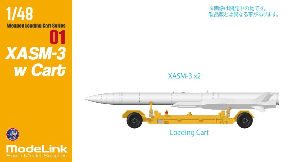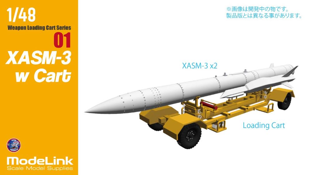 1/48 空自XASM-3 x2発と搭載用ウェポンカートのセットです。ASM-3は機体に搭載しても良いですが、カートにのせれば単体作品としても楽しめます。詳細なコーションデカール付属。