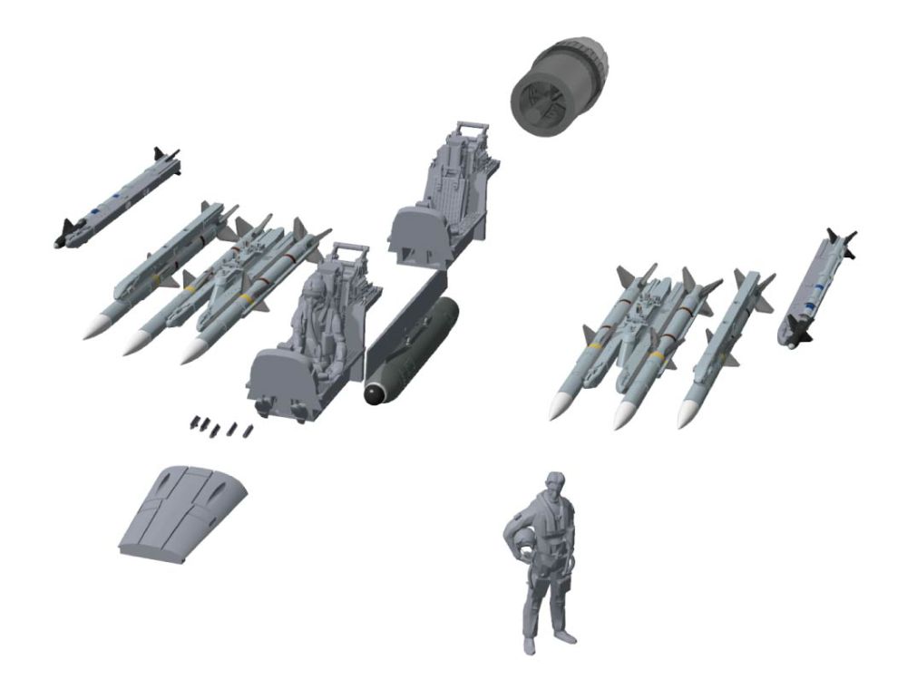 AIM120(シングル/デュアルランチャー x各2)、AIM-9X x2、Legion Pod、Sniper XR付属により空対空/空対地ミッション仕様が選択可能。LJDAM x2、扁平増槽 x2、エンジンノズル(電飾対応)、機首ガンパネル、IFFアンテナ、パイロット立像も付属。
