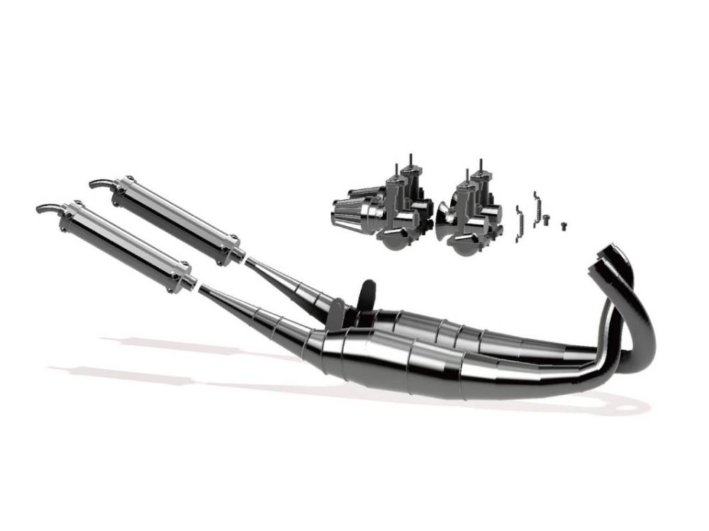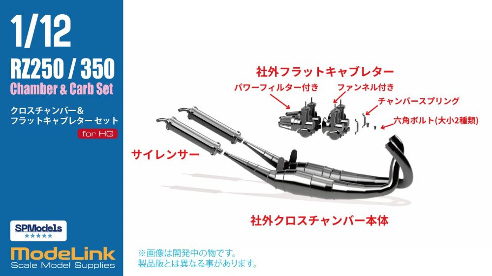H社の1/12 RZ250、RZ350用の社外クロスチャンバーと社外フラットキャブレターのセットになります。キャブレターはパワーフィルター付きとファンネル付きの2種類が付属します。チャンバースプリングや六角ボルトが複数個付属しますのでカスタムにお役立てください。詳しい組み立て方はnote記事をご参照ください。(記事作成中)*商品は無塗装です。使用の際は塗装してご使用ください。