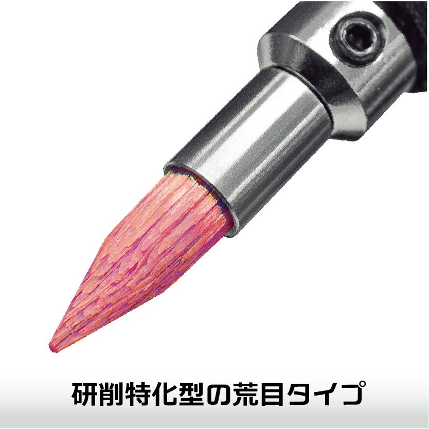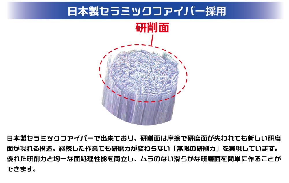 日本製セラミックファイバーで出来ており、研削面は摩擦で研磨面が失われても新しい研磨面が現れる構造。継続した作業でも研磨力が変わらない「無限の研削力」を実現しています。